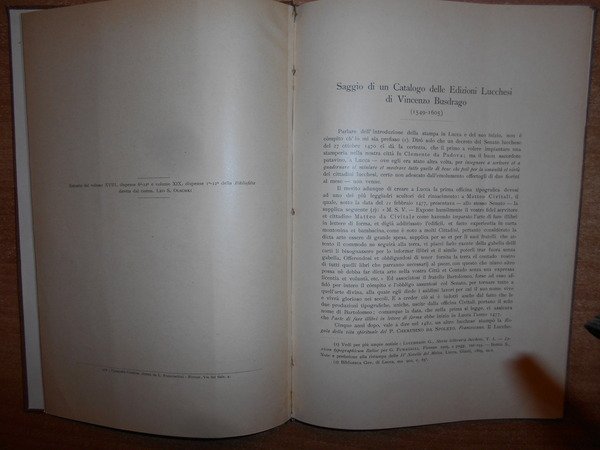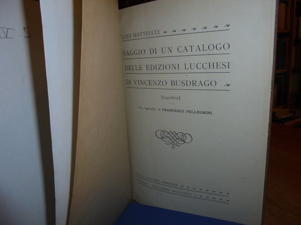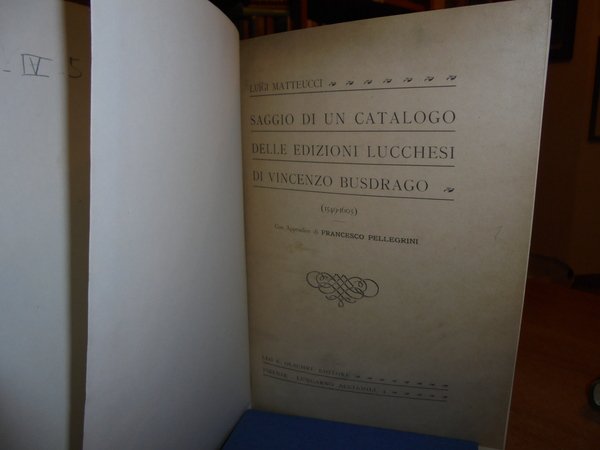 LUIGI, MATTEUCCI. Firenze, Lungarno Acciaioli, Leo S. Olschki Editore, 1918. SAGGIO DI UN CATALOGO DELLE EDIZIONI LUCCHESI DI VINCENZO BUSDRAGO (1549 - 1605). Con Appendice di FRANCESCO PELLEGRINI. In-8° grande, tela con titolo in oro entro tassello al dorso, copertine originali conservate. 95 pp. con riproduzioni di alcuni frontespizi nel testo. Ottimo esemplare in prima edizione con legatura recente e brossure originali conservate. Uff. E - IV - 5
