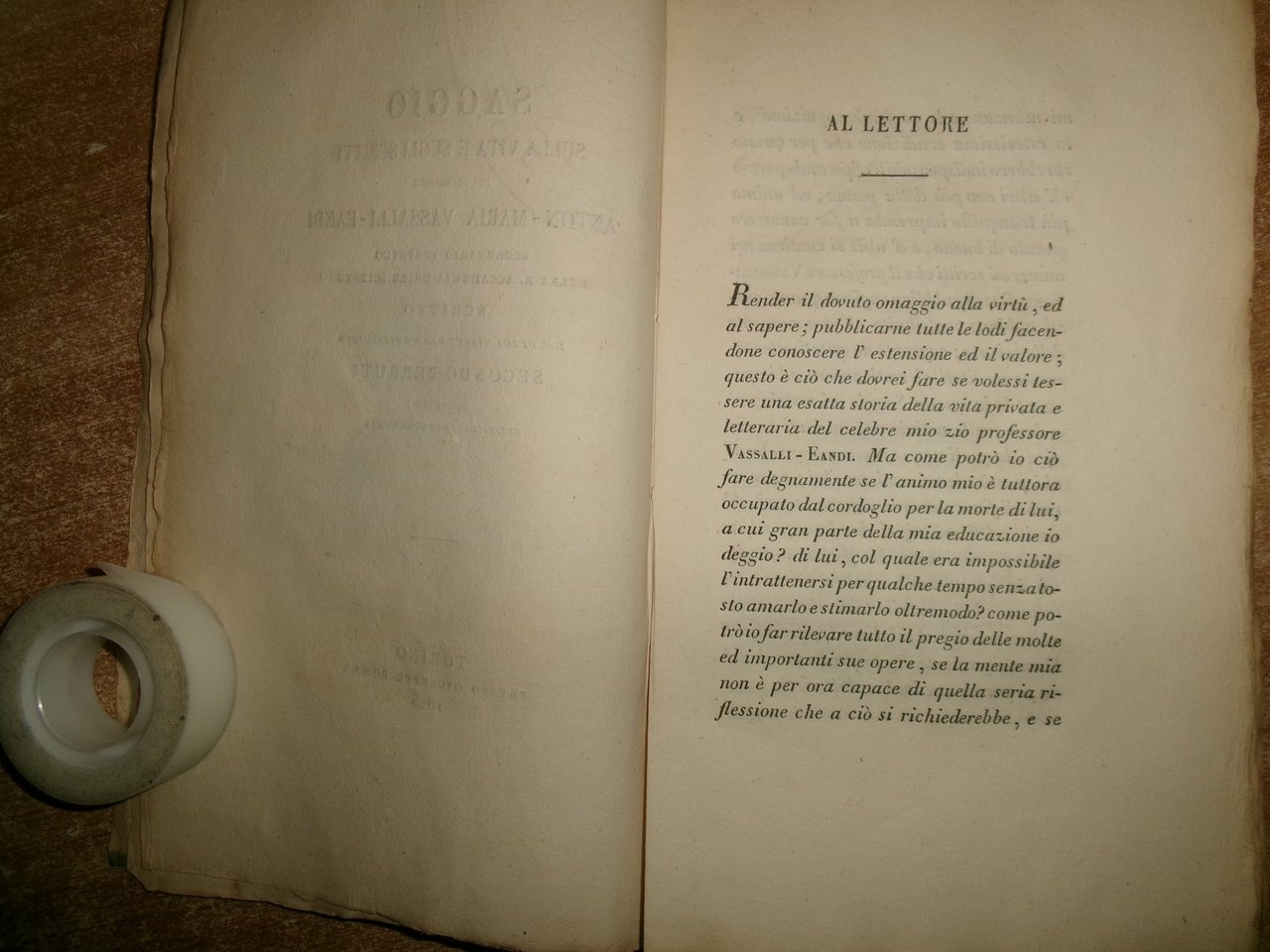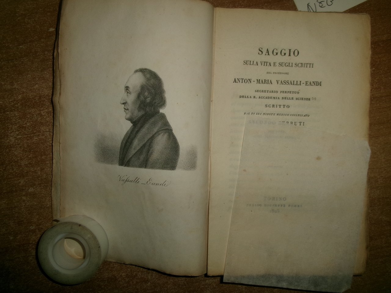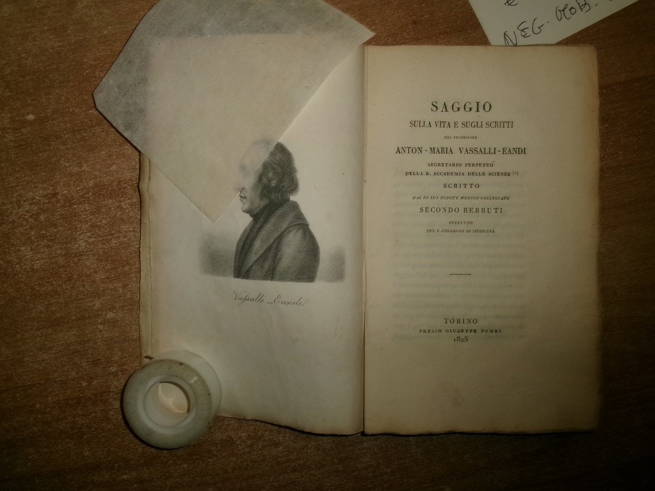 Saggio sulla vita e gli scritti del Professore Anton - Maria Vassalli - Eandi segretario perpetuo della R. Accademia delle Scienze scritto dal di lui nipote medico collegiato Secondo Berruti prefetto del R. Collegio di Medicina. In-8°, br. coeva azzurra con dedica dell' Autore non firmata a un chiarissimo professore dell' epoca che ha desiderato rimanere anonimo. 198, (2) pp., ritratto dell' Eandi litografato f.t. protetto da velina trasparente. Ottimo esemplare in edizione originale (completo). Neg. mob. 10 entro busta trasp.