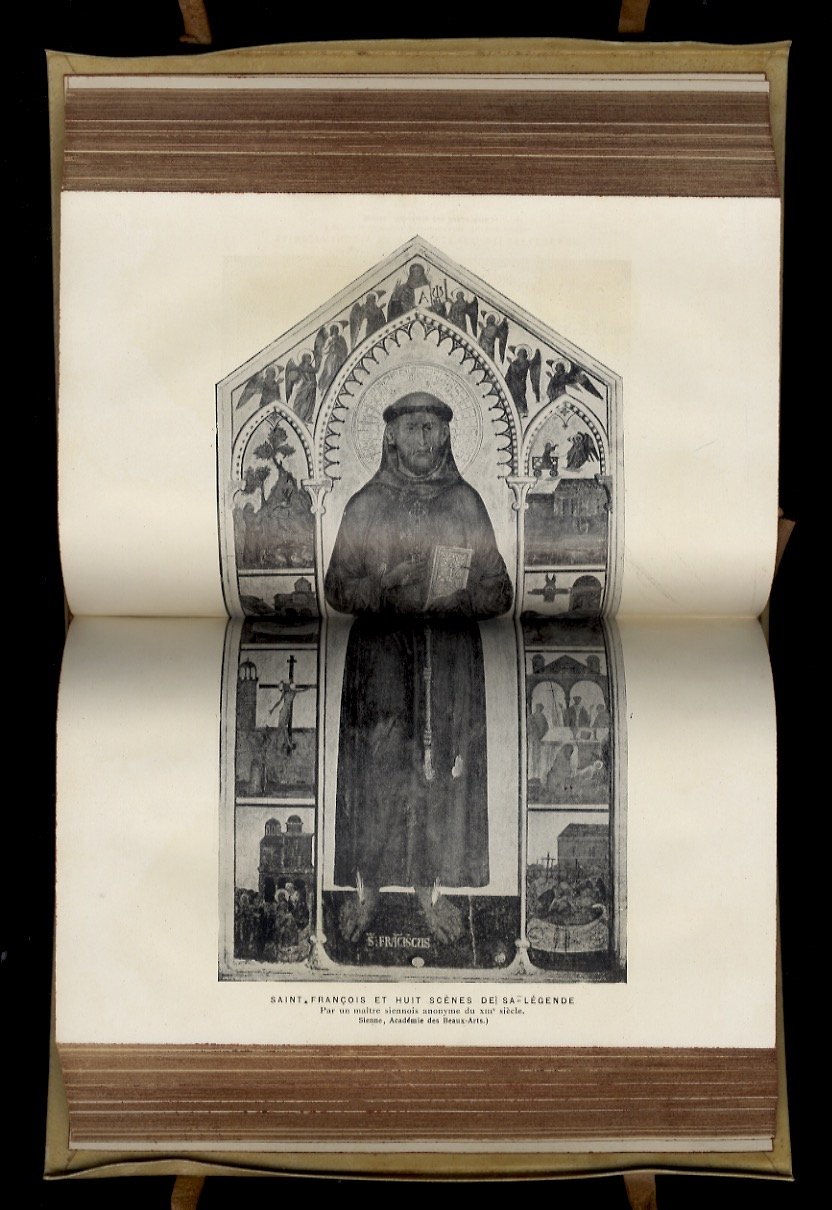 Paris, Perrin et C.ie, 1922, in-8, bella legatura coeva in stile neomedievale in piena pergamena; nervi in pergamena che passano sulle coperte intrecciandosi sopra strisce di pelle bruna le quali, partendo dal dorso, si inoltrano sui piatti fino quasi ai "labbri" (labbri che presentano un'unghiatura di circa mezzo cm), legacci in pelle, titolo calligrafato sul piatto anteriore con iniziali e decorazioni miniate a colori, tagli tinti, pp. [4], CII, 536. Con illustrazioni su tavole f.t. Perfette condizioni di conservazione. Queste tipologia di legatura fu tipica della bottega fiorentina dei Giannini e, pur non essendo firmata, potrebbe essere loro tranquillamente attribuita.