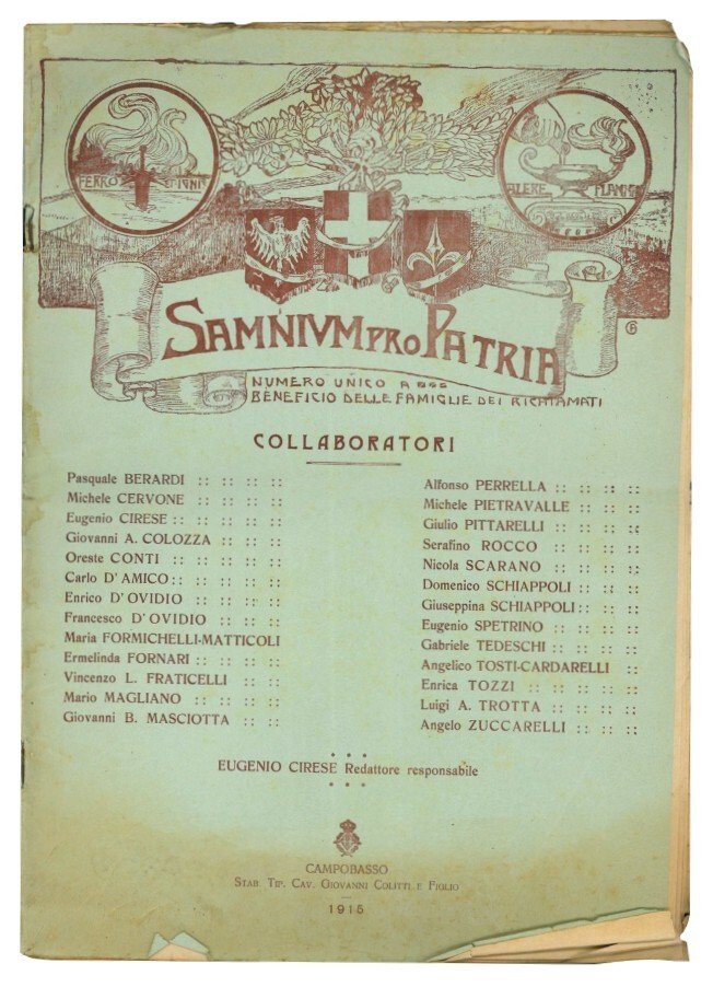 Mm. 353x255. Pp. 20. Con numerosi contributi di prose e versi, tra cui Michele Cervone, Carlo D'amico, Eugenio Spetrino e molti altri. Testo su due colonne, esemplare in barbe. Ultime cc. macchiate. Brossura editoriale con titolo alla cop. ant. e marca editoriale alla cop. posteriore (brossura marginalmente brunita, piccoli strappi alla brossura). Prima edizione di questo numero unico a beneficio delle famiglie dei richiamati.