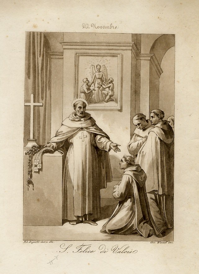 San Felice di Valois. 20. Novembre. Incisione all'acquatinta (c. cm. 28 x 20; parte incisa: 18x13) di gusto neoclassico, realizzata da G. Wenzel su disegno del pittore F. Bigioli (San Severino Marche, 1771-1854): mostra il santo che accoglie alcuni confratelli; in evidenza le catene da cui questi furono liberati: l'Ordine dei Trinitari era destinato al riscatto dei prigionieri cristiani in mano ai Mori. Tratto dall' opera: "Il Perfetto Leggendario, ovvero Vite de' Santi per ciascun giorno dell' anno", stampata in Roma nel 1847 (II ediz.) per cura dell'editore R. Gentilucci di Fabriano.