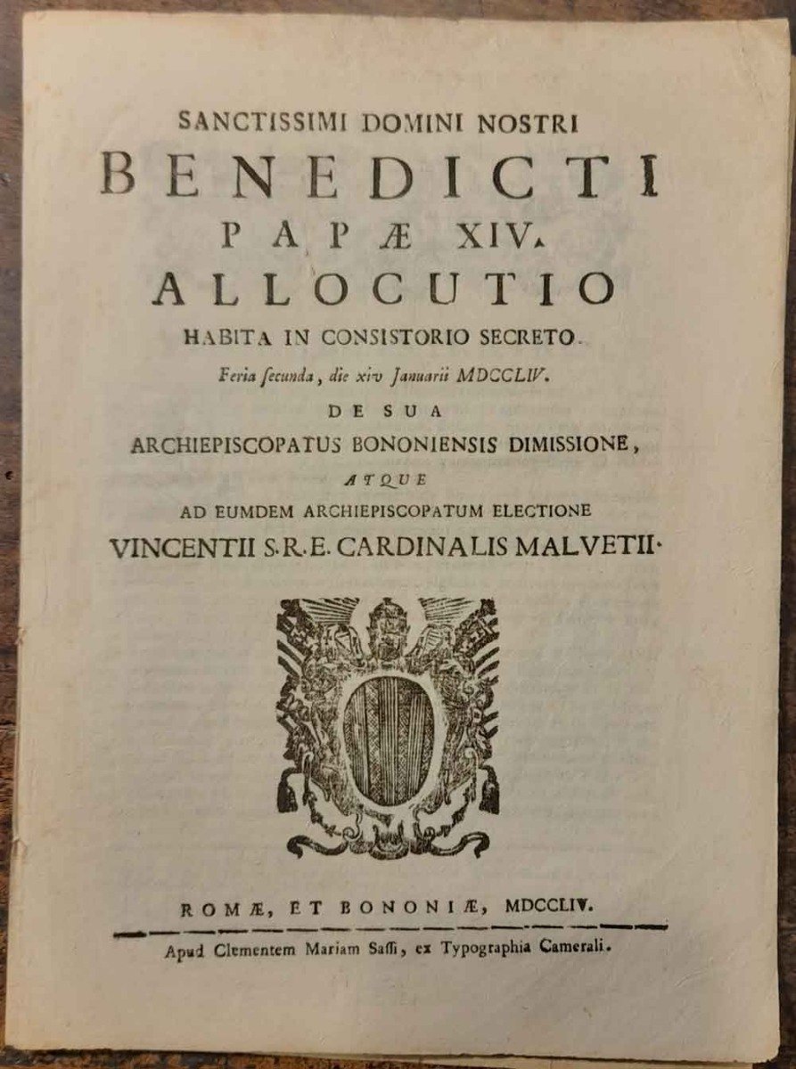 Sanctissimi Domini nostri Benedicti Papae XIV . Allocutio habita in Consistorio secreto. die XIV Januarii MDCCLIV de sua Archiepiscopatus Bononiensis dimissione atque ad. Electione Vincentii Cardinalis Malvetii