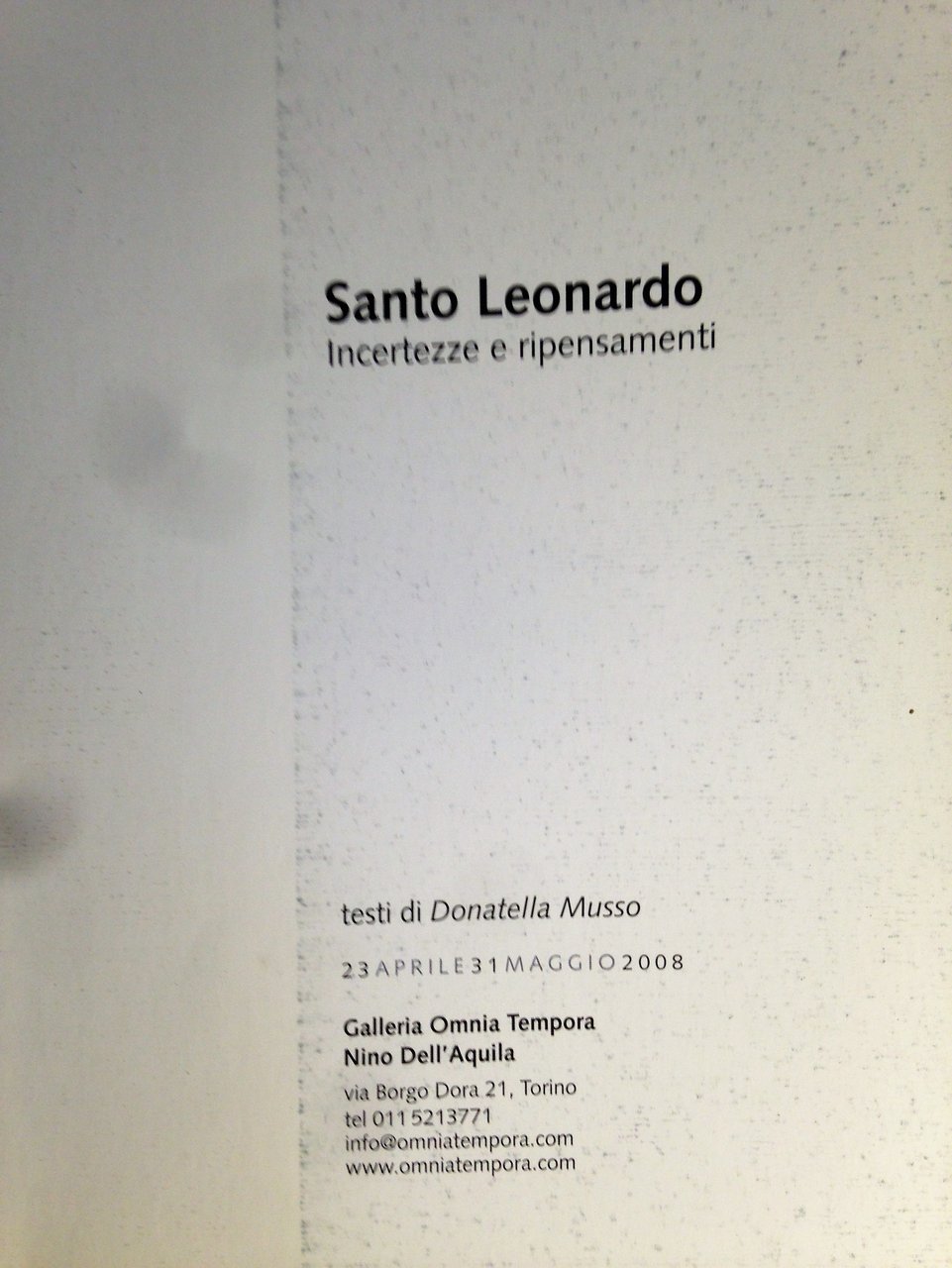 I ed.: aprile duemilaotto. Catalogo della mostra Torino, Galleria Omnia Tempora Nino Dell'Aquila (via Borgo Dora 21), 23 aprile 31 maggio 2008. VIII piccolo/ (36)/ brossura in cartoncino ruvido patinato con grafica in blu ardesia scuro, granata e bianco. Illustrazioni a colori f.t.. Stato buono (leggera usura della copertina - pagine lievemente brunite).