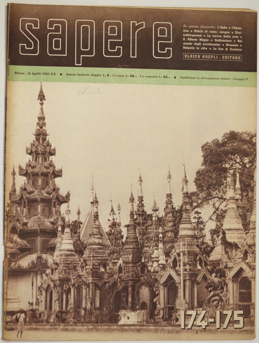 In folio. Dim. 32,5x24,5 cm. Pp. da 129 a 172. Numero del 15 aprile 1942 della piu antica rivista di divulgazione scientifica italiana fondata nel 1935. Tra gli articoli all'interno: L'importanza storia dell'Adriatico nell'economia mondiale, Miopia, Il bambino nelle monete imperiali di Roma, la carica della seta, San Alberto Magno, Nel mondo avvelenatori, Birmania, Bulgaria, La fine di Ercolano ecc. Numerose foto e illustrazioni all'interno, pubblicita d'epoca (Pirelli, ecc.). Brossura editoriale originale. Note manoscritte. In buone condizioni. Brossura editoriale in buone condizioni generali con lievi usure e parti mancanti ai margini e dorso. Legatura in buone condizioni. Pagine in buone condizioni con rare fioriture. Number of the 15th of april 1942 of the most ancient magazine of scientiphic divulgation established in 1935. Betweent the articles inside: The historical importance of Adriatico in world economy, The child of imperial coins of Rome, Charge of silk, San Alberto Magno, Poisononing, Birmania, Bulgaria, The end of Ercolano etc. Different photoes and illustrations inside. Original editorial cover. Handwritten notes. In good conditions. Editorial cover in good general conditions slightly worn in the edges and spine. Foxings. Binding in good conditions. Pages are in good conditions with occasional foxings.