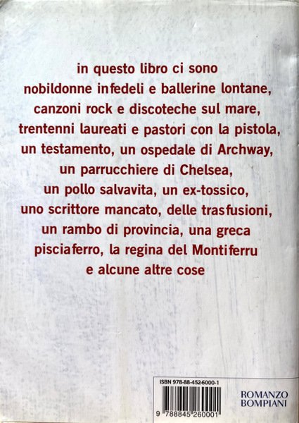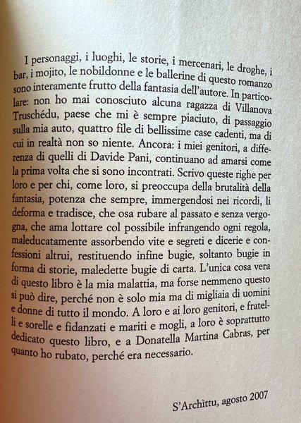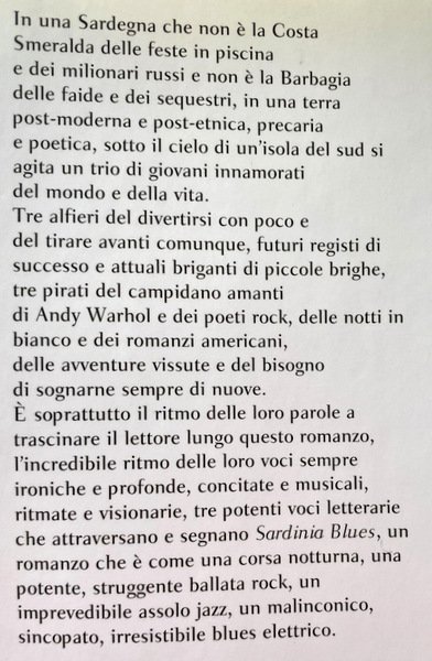 Soggetti: Letteratura italiana, Narrativa contemporanea, Romanzi italiani, Storie, Racconti, Scrittori sardi, Cultura sarda, Sardegna, Oristano, Anni Duemila, Davide Pani, Licheri, Corda, Uta, Bestsellers, Sardità, Musica, Isolamento, Vita di provincia, Successi editoriali, Lettura, Libri Vintage Fuori catalogo, Prime edizioni, Nobildonne infedeli, Ballerine lontane, Canzoni rock, Discoteche sul mare, Trentenni laureati, Pastori con la pistola, Testamento, Ospedale di Archway, Parrucchiere di Chels, Storia locale, Mitologia, Identità, Memorie, Biografie, Gioventù, Crisi dell’età di passaggio, Malattia, Talassemici, Racconti autobiografici, Bellas Mariposas, Sergio Atzeni, Italian literature, Contemporary fiction, Italian novels, Stories, Short stories, Sardinian writers, Sardinian culture, Sardinia, 2000s, Music, Isolation, Provincial life, Editorial successes, Reading, Out of print books, First editions, Infidels noblewomen, Distant dancers, Songs, Discos on the sea, Thirty-year-old graduates, Shepherds with guns, Testament, Local history, Mythology, Identity, Memories, Biographies, Youth, Crisis of the passing age, Illness, Thalassemia, Autobiographical stories