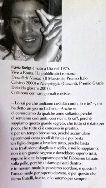 Flavio Soriga è nato a Uta, in provincia di Cagliari. A venticinque anni ha vinto il premio Italo Calvino per inediti. Lavora al programma di Rai3 “Per un pugno di libri” e organizza festival e incontri letterari. I suoi romanzi sono pubblicati da Bompiani. Vincitore nel 2000 del Premio Italo Calvino per inediti con la raccolta di racconti Diavoli di Nuraiò (Il Maestrale), nel 2002 ha pubblicato per Garzanti il romanzo Neropioggia (Premio Grazia Deledda Giovani 2003). Nel 2003, Soriga ha partecipato come autore italiano al progetto Scritture Giovani del Festiva letteratura di Mantova. È stato accostato alla Nuova letteratura sarda formata, tra gli altri, da Sergio Atzeni, Salvatore Mannuzzu e Giulio Angioni.