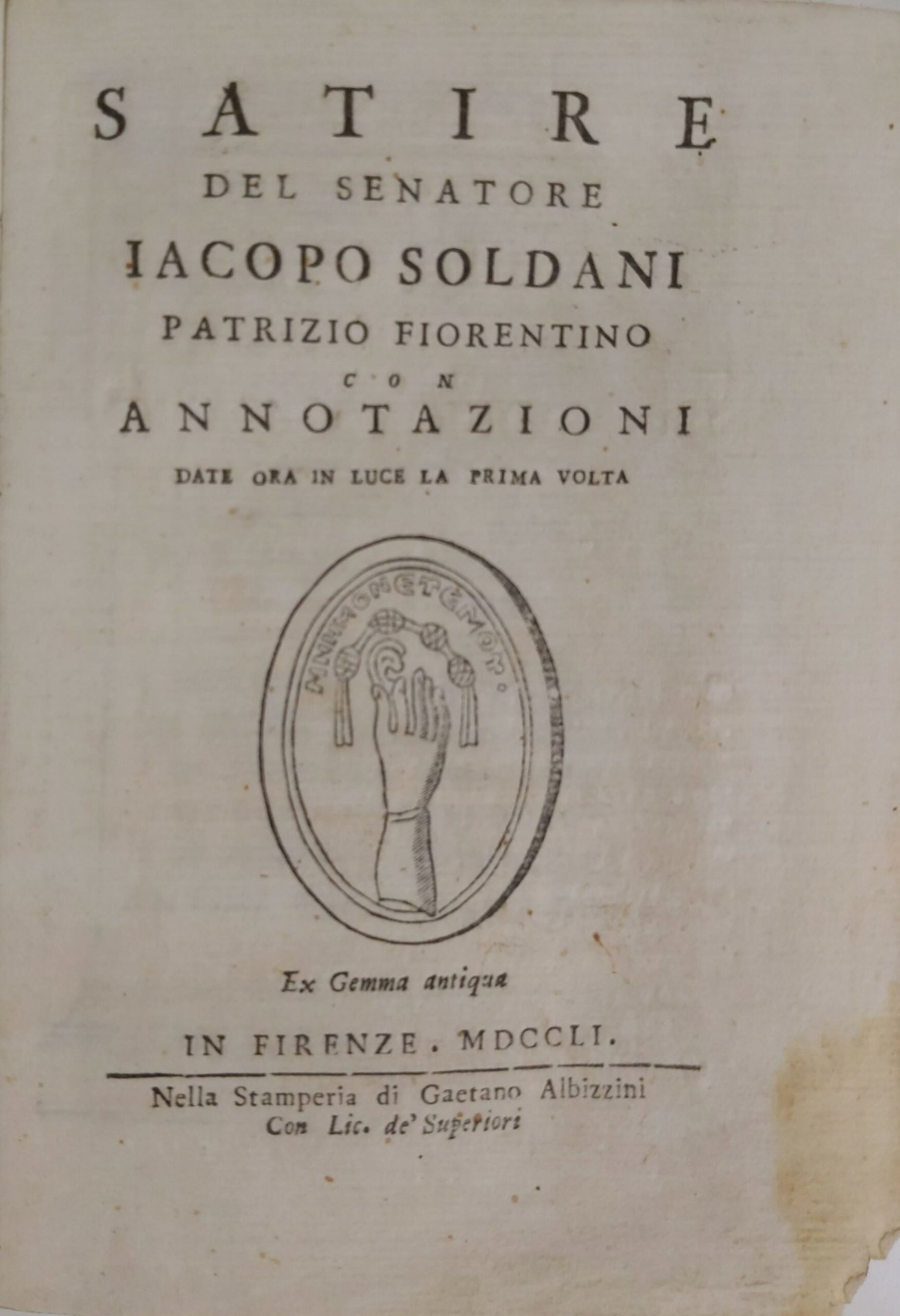 in-8, pp. XL, 239, leg. cart. rust. coeva con tit. mss al d. Antip. col ritr. del Soldani inc. da J. Verkruyfs. Marca tipogr. al front. e iscriz. dedic. a G. Bottari composta F. Gori. Prima ediz. delle celebri sette Satire del S. curata da Gori autore anche della biografia dello stesso. Le annotaz. poste al fine sono di G. Bianchini di Prato. Gamba 926: “Edizione stimabile. di cui gli autori del Vocabolario della Crusca avrebbero certamente fatto uso, se non fosse uscita posteriormente alla pubblicazione del Vocabolario”. Il ritr. del Soldani è qui posto come antip. e non alla fine della prefaz. come riferisce il Gamba. Bell’esempl. a larghi margini. [399-2]