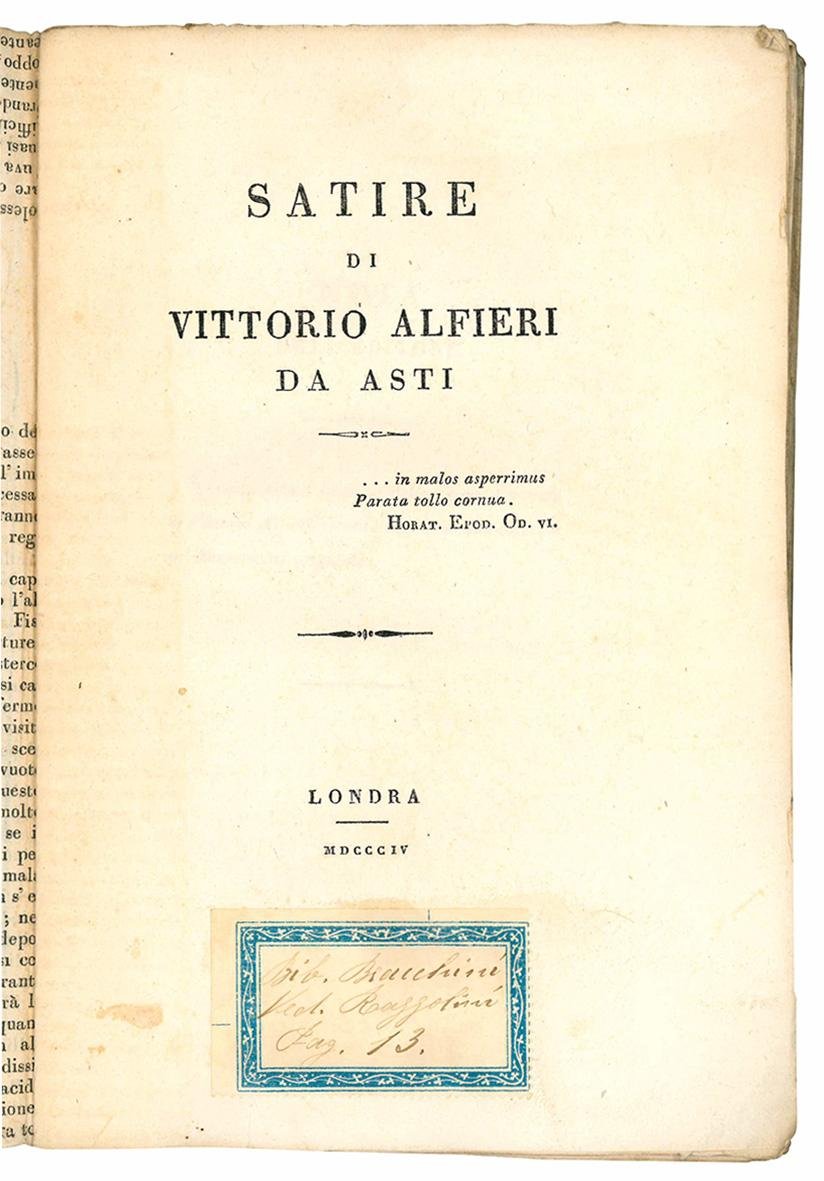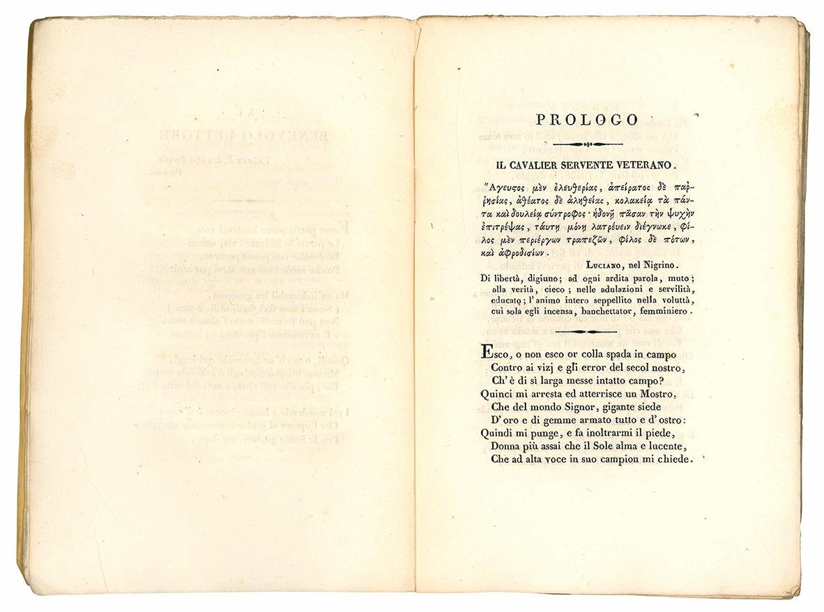 In 8vo (mm 219x146); pp. 108, [4]. Lievi fioriture diffuse, piccolo alone all'angolo esterno inferiore delle pp. 77-80. Brossura muta coeva. Nota di possesso manoscritta su tassello cartaceo applicato al margine inferiore del frontespizio. Nel complesso bell'esemplare fresco e ad ampi margini della prima edizione delle Opere Postume pubblicate a Firenze, da Piatti, nel 1804.