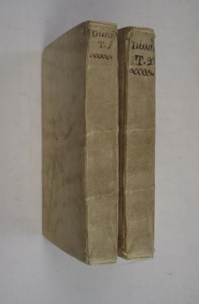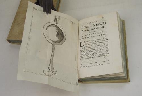 Quattro parti legate in due volumi di cm. 17, pp. (8) c In Venezia, appresso Agostino Savioli, poi Domenico Deregni, 1750-51, voll. 4, legati in 2, in-16, cartonatura coeva, titolo in oro su tasselli in pelle ai dorso, pp. (8), 76, 46, 86, 37; 212 (2); 218 (2); 222, (2). Con 10 (di 12!) tavole incise in rame ripieg. f.t. Solida legatura coeva in piena pergamena rigida, dorsi a piccoli nervi con titoli manoscritti. Macchiette limitate ad un paio di pagine, peraltro esemplare fresco e genuino, in ottimo stato di conservazione. Dall'elenco delle dissertazioni: "Dell'origine dell'idolatria"; "Sopra Bell-fegor, Camos e altri Dei de' Moabiti" di A. Calmet, "Della teologia de' Caldei" di Ferdinando Paoletti, "Della religione de' Persiani" di R. Lanini, "Sopra il primo inventore della bussola" di Gregorio Grimaldi, "Delle bilance degli antichi" di Luigi Lorenzi, "Dei coli vinari degli antichi" di Filippo Venuti, "Del primo inventor degli occhiali da naso" di Domenico M. Manni, "Sopra le ciste mistiche" e "Sopra i serpenti sacri" di Giovanni Lami, "Sopra un bassorilievo indicante il gioco dela salto sull'otre" di Ridolfino Venuti, "Sopra gli anfiteatri toscani" di Lorenzo Guazzesi, "Sopra l'auruspicina toscana o sia l'arte di indovinare" di Bindo Simone Peruzzi.