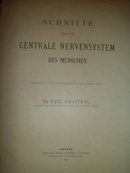 .des Menschen. Gefertigt, photographiert und erläutert von KRONTHAL, Paul. Berlin: Speyer & Peters, 1892. In-folio, br., (44) pp. e 18 tavole monocrome in fotoincisione su cartoncino protette da veline. Bellissimo atlante anatomico del sistema nervoso.