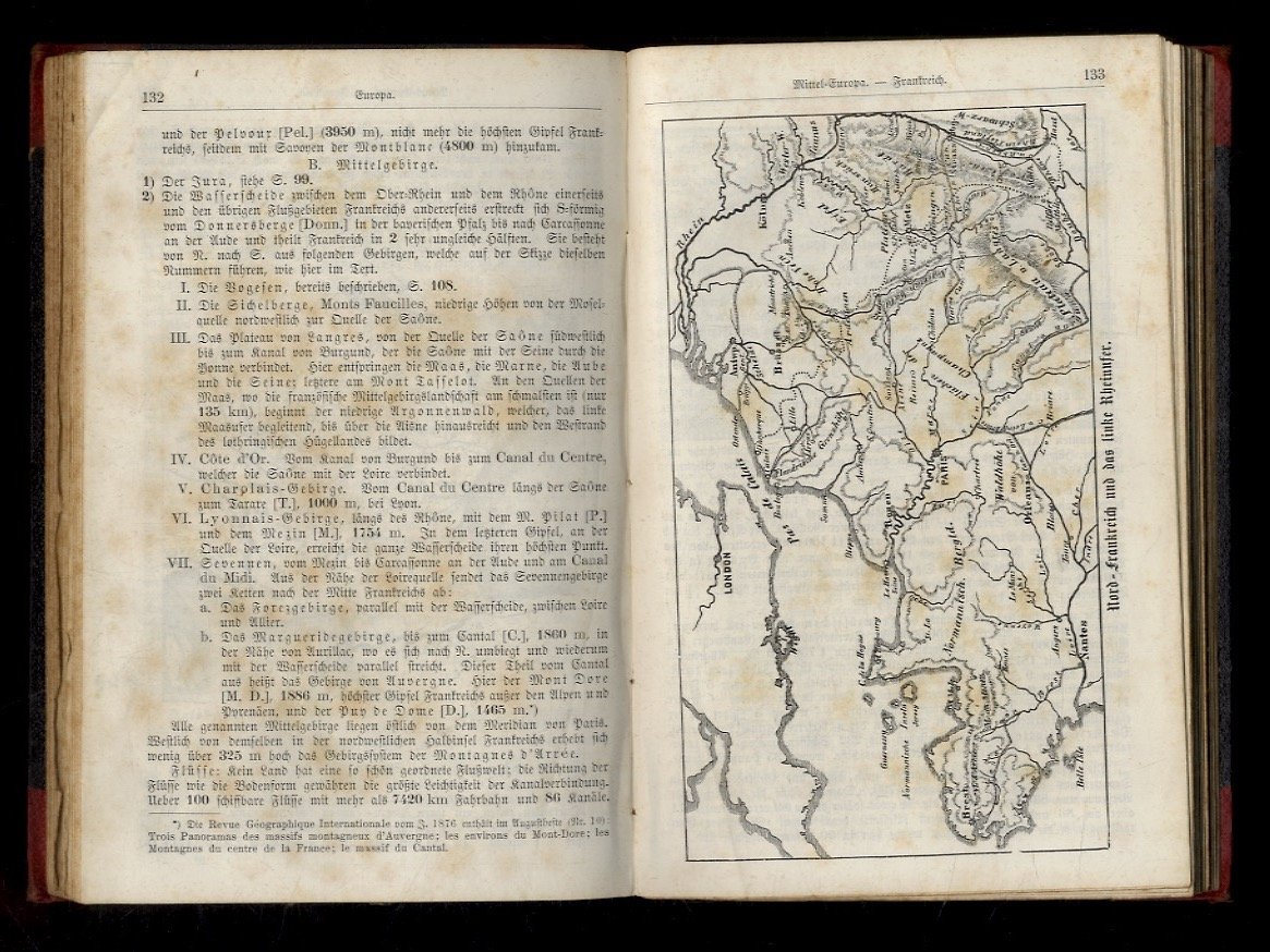 Breslau, Ferdinand Hirt, 1878, in-8, legatura coeva in mezza tela rossa con punte (imitante un mezzo marocchino), titolo in oro al dorso, pp. VIII, 368. Con cartine e figure n.t. "Ernst von Seydlitz'sche Geographie. Siebenzehnte Bearbeitung". Buon esemplare.