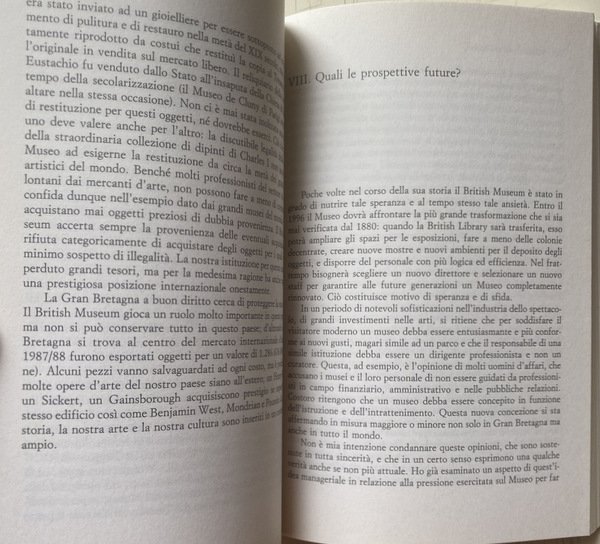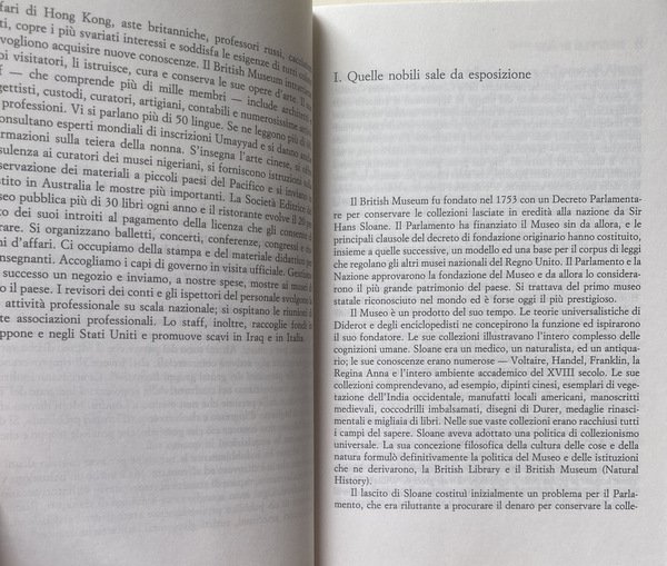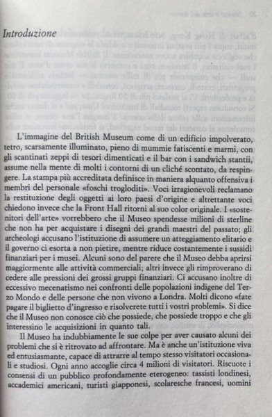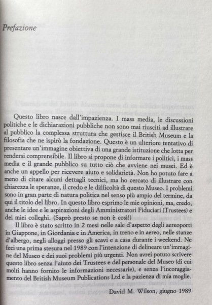 Vicende istituzionali, problemi museologici e museografici del più grande museo anglosassone sono oggetto della vivace e brillante riflessione di uno dei suoi più autorevoli direttori, David M. Wilson, che è a capo del museo per quindici anni e dichiara di aver scritto questo libretto, pubblicato nel 1989, per la cura dei Trustees dello stesso museo, più tra un aeroporto e l'altro, che nella calma del suo studio. Detto questo ci si potrebbe aspettare di avere tra le mani il giornale di bordo di un manager museale, secondo una tipologia che, su imitazione americana, si è diffusa in parte anche in Europa.