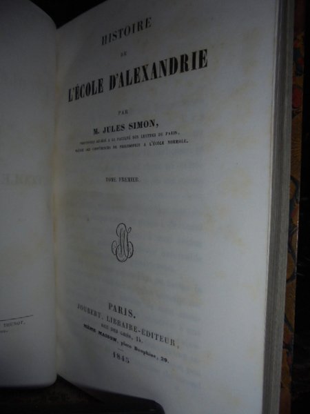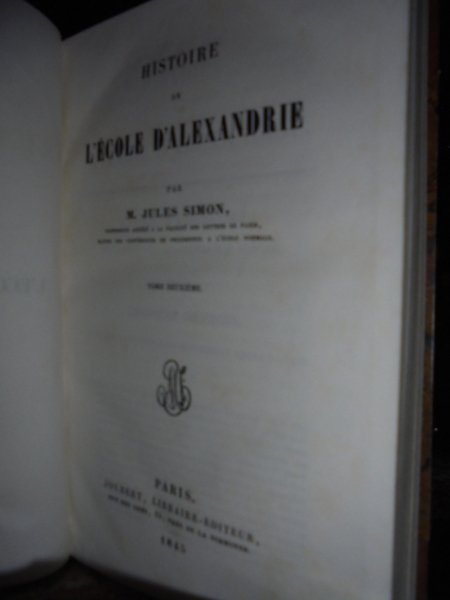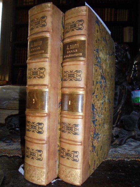 SIMON, Jules. Paris, Joubert, 1845. (Scienze-Religioni) Histoire de l' Ecole d' Alexandrie. 2 volumi in-8°, m. pelle coeva, titolo in oro e fregi a secco neldorso. (4), 602 pp.; (4), 692 pp. Bell' esemplare della rara edizione originale. Caillet, 10208: << Cette histoire de la fameuse Ecole d' Alexandrie est fort recherchée pour sa haute valeur: elle contient un exposé complet da la doctrine des principaux philosophes qui allèrent chercher l' initiation dans la métropole égyptienne. >>. Neg. esot. mob. 102