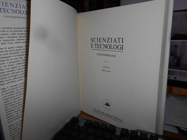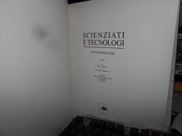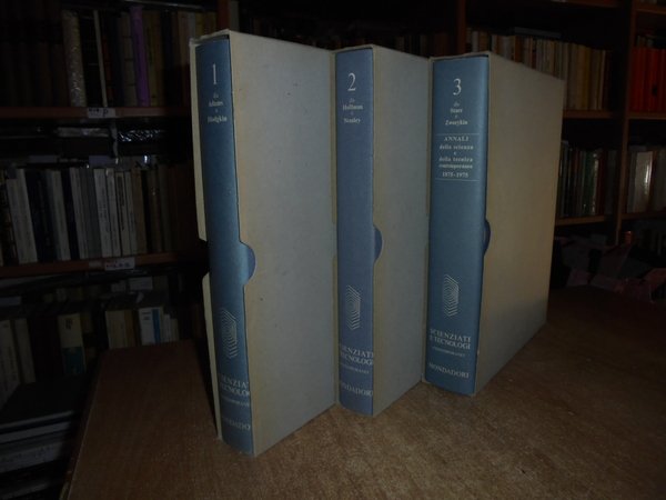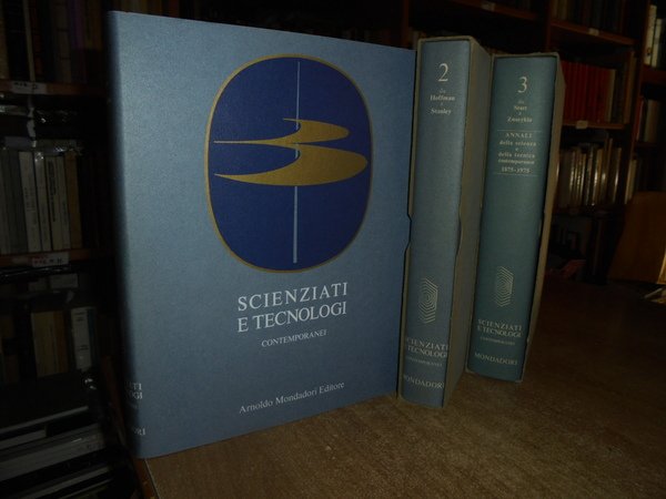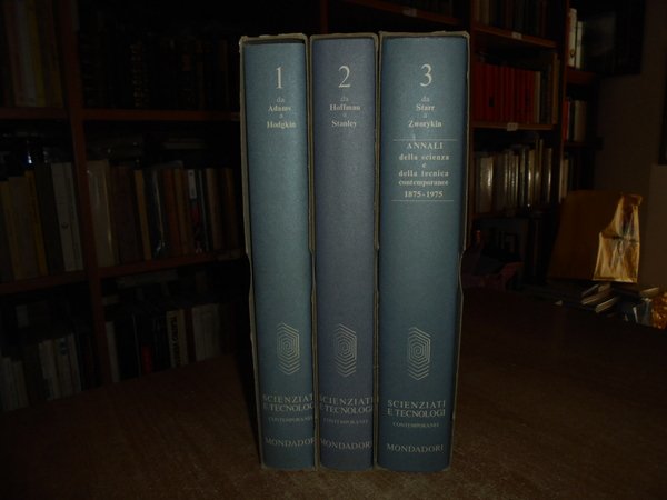 AA. VV. Milano, Arnoldo Mondadori, 1974. SCIENZIATI E TECNOLOGI contemporanei da Adams Roger a Hodhkin Dorothy. 3 volumi in-4°, tela edit. e oro. Vol. I. da Adams Roger a Hodhkin Dorothy. 527 pp.; Vol. II. da Hoffman Samuel K. a Stanley Wendell M. 527 pp.; Vol. III. da Starr Chauncey a Zworykin Vladimir K. Annali della Scienza e della tecnica contemporanee 1875-1975. 738 pp. I tre volumi sono corredati da innumerevoli illustrazioni la maggior parte in bianco e nero. Esemplare come nuovo conservato negli astucci in cartoncino muto. Uff. C - I - 5