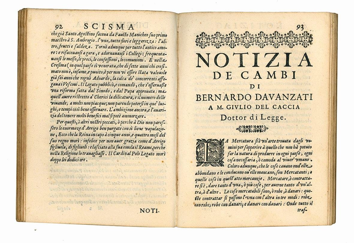 Prima edizione degli importanti scritti economici del Davanzati, ossia la Lezione della moneta, la Notizia de' cambi e la Coltivazione toscana delle viti e d'alcuni arbori, qui assolutamente completi.