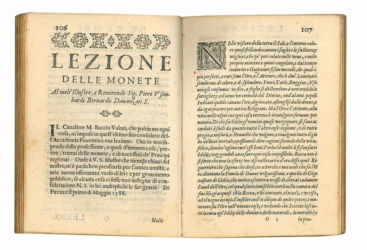 La Lezione della moneta, letta nel 1588 presso l'Accademia Fiorentina in risposta ad un quesito sul modo di riparare ai disordini monetari dell'epoca e alla diffusa pratica dell'alterazione delle monete, contiene un studio approfondito sul valore dei metalli; traccia una breve storia sull'origine e l'uso della monete; mette in guardia contro i danni arrecati all'economia dall'alterazione o dalla diminuzione della bontà metallica della moneta; pone infine in relazione la quantità di moneta circolante e il livello dei prezzi, indicando nell'oro americano la causa principale del brusco aumento dei prezzi verificatosi nel secondo Cinquecento.