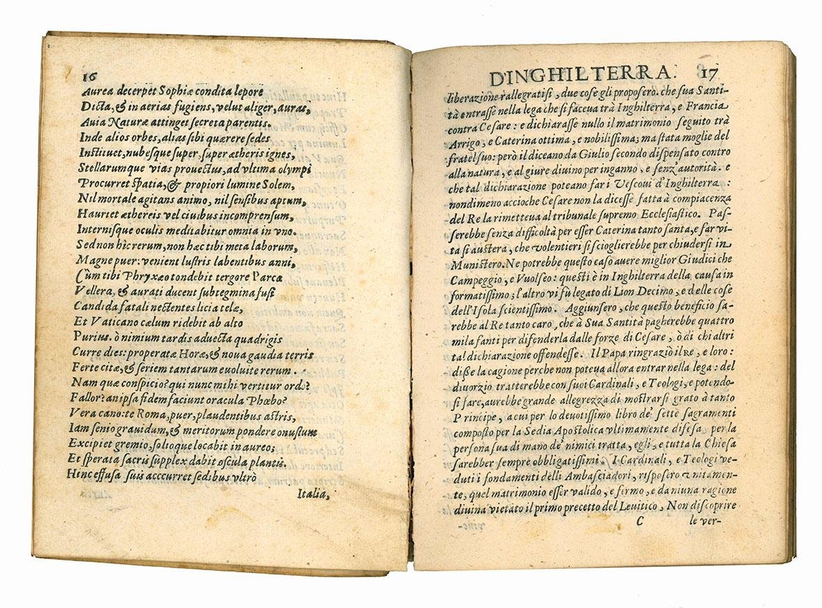 In 4to (mm. 195x140). Pp. [12], 204. Segnatura: †6 A-Aa4 Bb6. Esemplare mancante delle prime carte (pp. [12], 1-16. Segnatura: †6 A-B4), contenenti il frontespizio con lo stemma del granduca Ferdinando II al recto e il ritratto dell'autore inciso in legno al verso, la prima dedica a Giovanni Bardi, la seconda dedica degli stampatori al Granduca, la vita del Davanzati scritta da Francesco di Raffaello Rondinelli e l'inizio della prima opera Scisma d'Inghilterra. Le carte mancanti sono state sostituite intenzionalmente, vista la numerazione e la segnatura coincidenti, con le prime 16 pagine (segnatura: A-B4) dell'opera Aurelii Ursi Perettina sive Syxti V. Pont. Max. Horti Exquilini (Roma, Giovanni Martinelli, 1588), compreso il frontespizio di questa seconda opera che reca lo stemma xilografico del pontefice entro cornice. Capilettera, frontalini e finalini xilografici. Due timbri antichi e varie note manoscritte di possesso al frontespizio: "Del conte Orsini Rilli"; "Di Gio. [...] di Poppi"; "Dell'Ill. Raffaello Cerreteli". Fori di tarlo alle prime tre carte che interessano solamente una lettera al frontespizio, carta lievemente brunita, fioriture e aloni ad alcune carte. Pergamena coeva (un po' iscurita, lievi abrasioni ai piatti e al dorso).