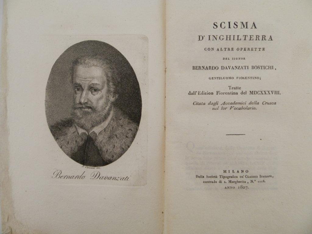 Scisma d'Inghilterra con altre operette del signor Bernardo Davanzati Bostichi gentiluomo fiorentino tratte dall'edizion fiorentina del 1638 citata dagli accademici della Crusca nel lor vocabolario
