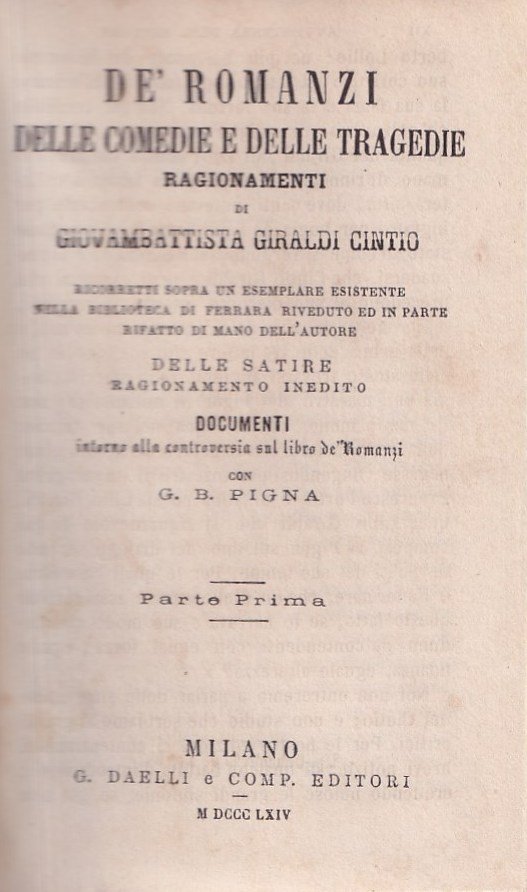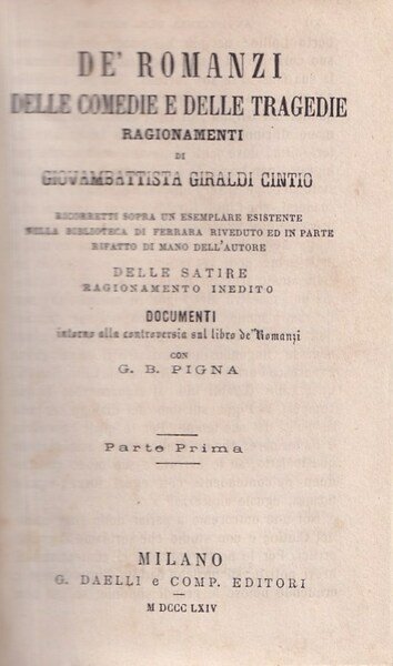 Due opere facenti parte della "Biblioteca rara" dell'editore Daelli di Milano, riunite in un unico tomo rilegato con titoli in oro al dorso. Contiene: Giambattista Giraldi Cintio, "Scritti estetici. De' romanzi, delle commedie e delle tragedie. Ragionamenti di Giovambattista Giraldi Cintio ricorretti sopra un esemplare esistente nella biblioteca di Ferrara riveduto ed in parte rifatto di mano dell'autore. Delle satire - ragionamento inedito. Documenti intorno alla controversia sul libro de' Romanzi con G.B. Pigna", parti prima e seconda, xlvi-224 + 166 pagine; Gerolamo Gigli, "Il gazzettino. Nuova edizione corretta col riscontro del Codice della Biblioteca di Siena, per cura di L. Banchi", xl-178 pagine. Esemplare perfettamente conservato. SPEDIZIONE IN 24 ORE DALLA CONFERMA DELL'ORDINE.