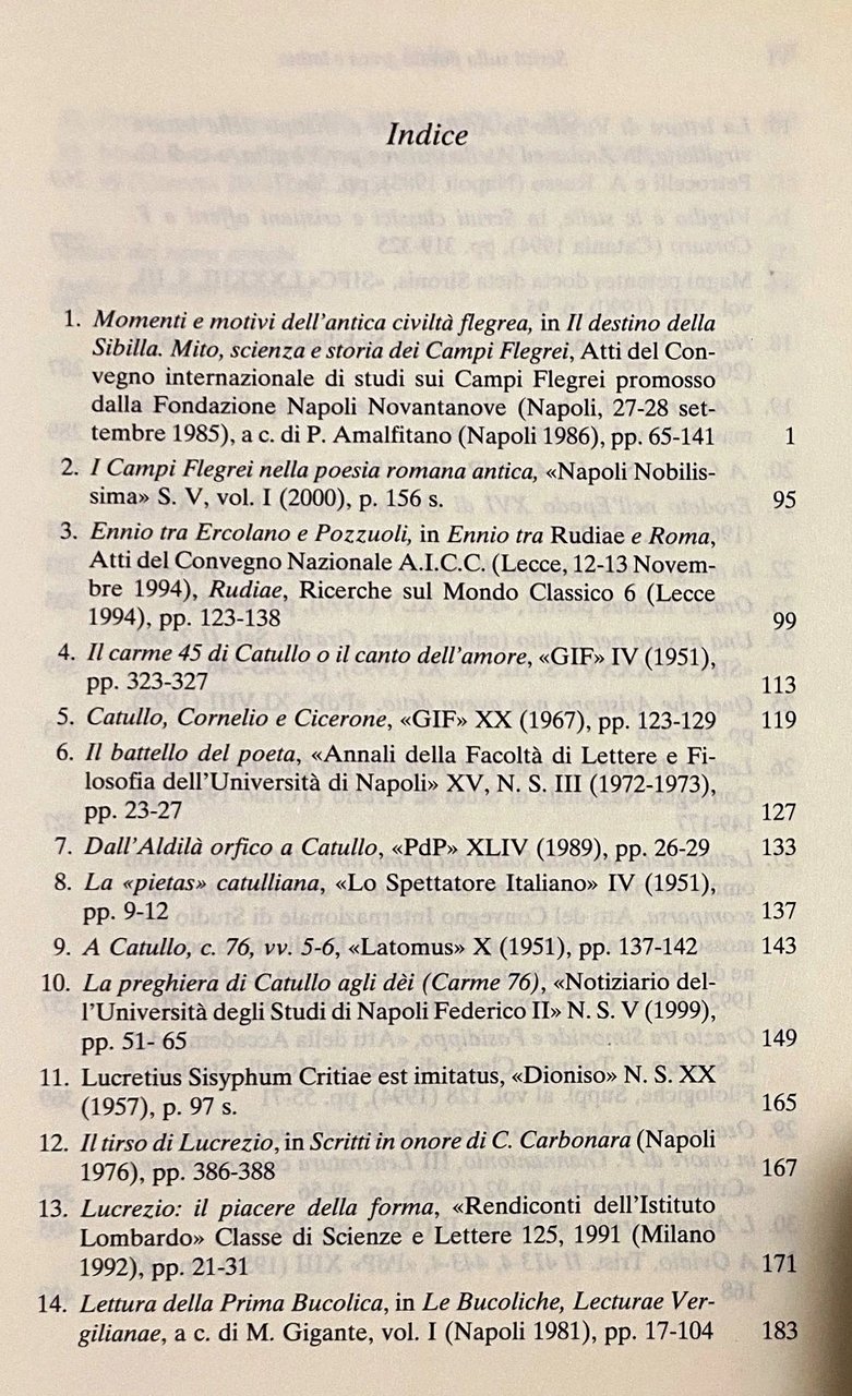 Soggetti: Letteratura greca latina Romana Poesia Filologia Metrica Storia Critica letteraria Lirica Inni Lingua antica medievale Lingue antiche Linguistica Impero Romano Cultura classica orale Poetica Civiltà Magna Grecia Omero Esiodo Scritti Culti Campania Bacco Giambi Elegie Vesuvio Ninfee Archiloco Catullo Callimaco Lesbia Odisseo Ulisse Thanatos Pompei Ercolano Alicarnasso Epigramma ellenistico Ellenismo Papirologia Età ellenistica Tyrtaeus Aristofane Eschilo Sofocle Euripide Satira Drammaturgia Teatro Tragedia Simbolismo Dioniso Nosside Siracusa Filodemo Epigrafi Testi orfici Esegesi Alcmane Saffo Mimnermo Oracoli Cuma Campi Flegrei Sibilla Cicerone Cornelio Carmi Lucrezio Odi Virgilio Bucoliche Georgiche Eneide Iliade Odissea Poemi Frammenti Seneca Orazio Ovidio Adorno Horkheimer Licofrone Manara Valgimigli Platone Aristotele Sinestesia Lirismo Lira Melagno Pfeiffer Pugliese Carratelli Quasimodo Nauck Page Muehll Morelli Pruckner Santo Mazzarino Albin Lesky Merkelbach Kranz Schliemann Opere generali pregiate Giorni Nietzsche Poeti latini Epica Accademia Pontaniana Estetica Eros Uccelli Greek Literature Latin Poetry Philology Metric History Literary Criticism Lyric Hymns Ancient Language Medieval Languages Linguistics Roman Empire Classical Culture Poetics Civilization Great Greece Homer Hesiod Writings Cults Bacchus Vesuvius Waterlilies Archilochus Catullus Callimachus Odysseus Ulysses Pompeii Herculaneum Halicarnassus Epigram Hellenism Papyrology Hellenistic Age Aristophanes Aeschylus Sophocles Euripides Dramaturgy Theater Tragedy Symbolism Dionysus Nossis Syracuse Philodemus Epigraphs Orphic texts Exegesis Sappho Phlegraean Fields Sybil Cornelius Lucretius Odes Virgil Iliad Odyssey Poems Fragments Horace Lycophronus Aristotle Synesthesia Lyricism General works Poets Aesthetics Birds Collezionismo Antichità Collectibles References Endecasillabi Hendecasyllables Valuable Lehnus Atena Acropoli Vino Adriana Quattordio Moreschini Agostiniani Arcamone Carruba Imparati Rizza Nazarena Valenza Mele Iezzi Astianatte Arhiloco Viaggio Mitologia Miti Déi Spirito Dionisiaco Apollineo Peana Delfico Teodorida Epitalamio Epigrammi Paratore Esegetica Coleman Bindi Del Corno Saint-Denis Benedetto Croce Diehl Gow Goethe Fraenkel McIntosh Snyder Nisbet Parsons Perret Pasquali Putnam Amedeo Maiuri Hubbard Kaibel Kiessling La Penna Liegle Leopardi Mannebach Skutsch Sgobbo Reitzenstein Ronconi Rostagni Wilamowitz Moellendorf Traina Usener