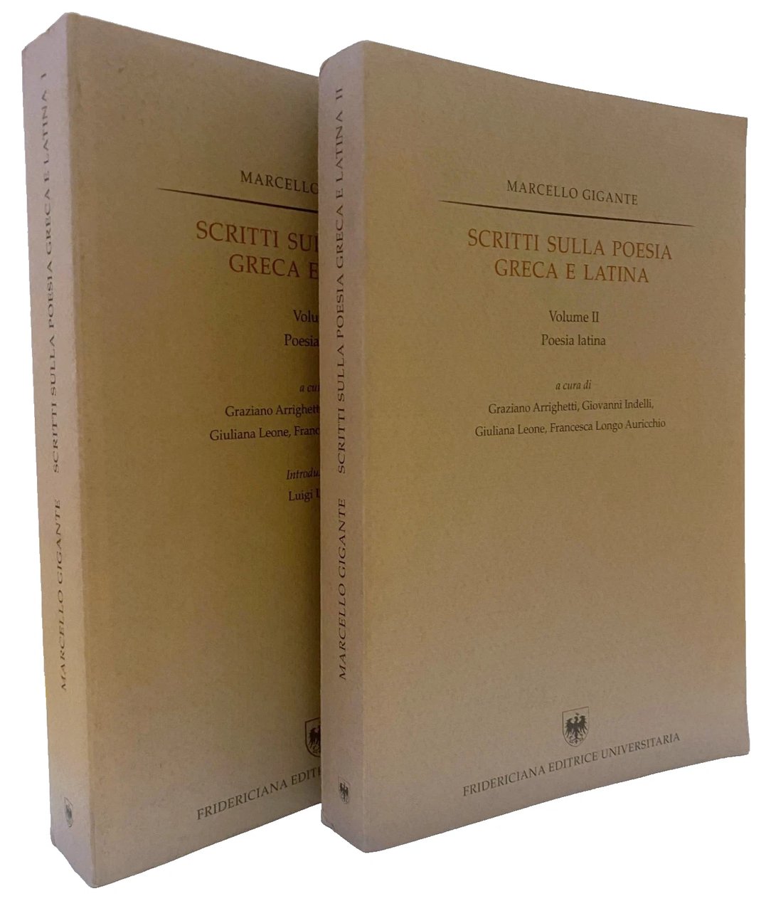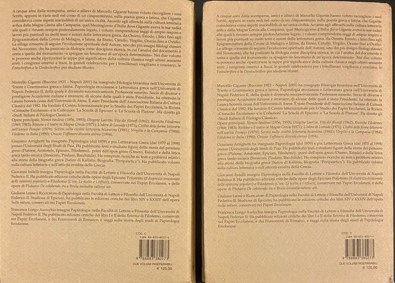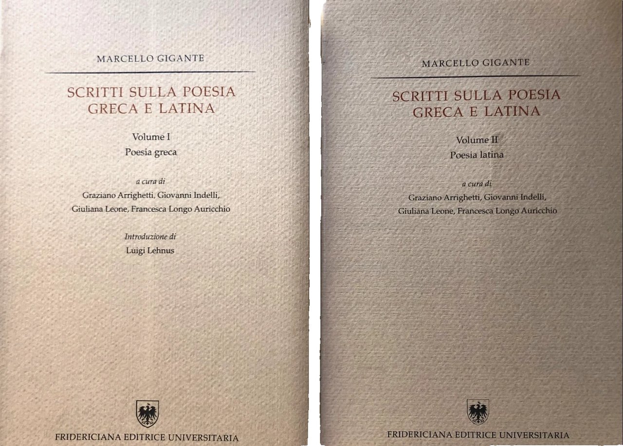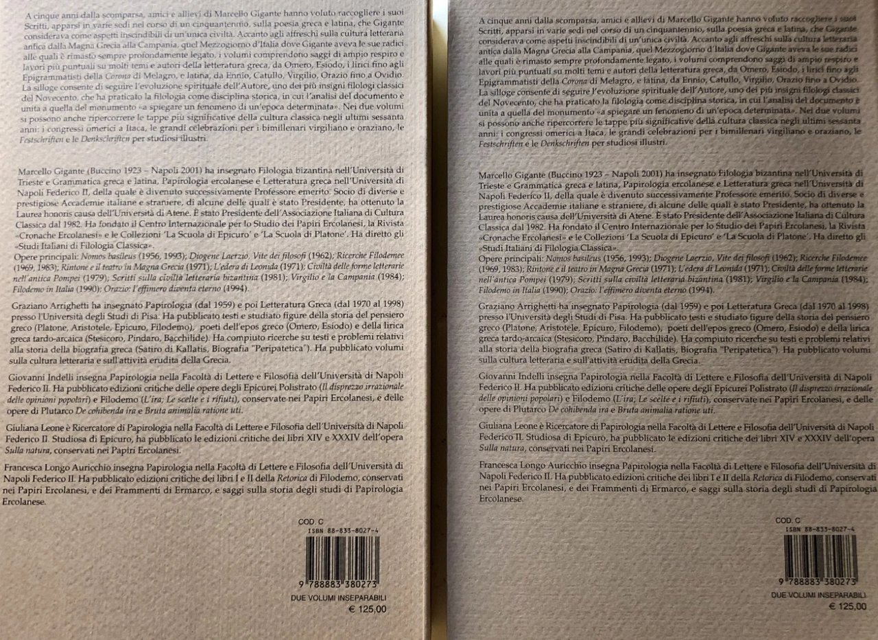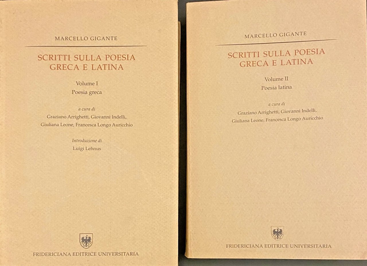 A cinque anni dalla scomparsa, amici e allievi di Marcello Gigante hanno voluto raccogliere i suoi scritti, apparsi in varie sedi nell'arco di oltre un cinquantennio, sulla poesia greca e latina, che Gigante considerava come aspetti inscindibili di un'unica civiltà. Accanto agli affreschi sulla cultura letteraria antica dalla Magna Grecia alla Campania, quel Mezzogiorno d'Italia dove Gigante aveva le sue radici alle quali è rimasto sempre profondamente legato, i volumi comprendono saggi di ampio respiro e lavori più puntuali su molti temi e autori della letteratura greca, da Omero, Esiodo, i lirici fino agli Epigrammatisti della Corona di Meleagro, e latina, da Ennio, Catullo, Virgilio, Orazio fino a Ovidio. La silloge consente di seguire l'evoluzione spirituale dell'autore, uno dei più insigni filologi classici del Novecento, che ha praticato la filologia come disciplina storica, in cui l'analisi del documento è unita a quella del monumento "a spiegare un fenomeno di un'epoca determinata". Nei due volumi si possono anche ripercorrere le tappe più significative della cultura classica negli ultimi sessanta anni: i congressi omerici a Itaca, le grandi celebrazioni per i bimillenari virgiliano e oraziano, le "Festschriften" e le "Denkschriften" per studiosi illustri.