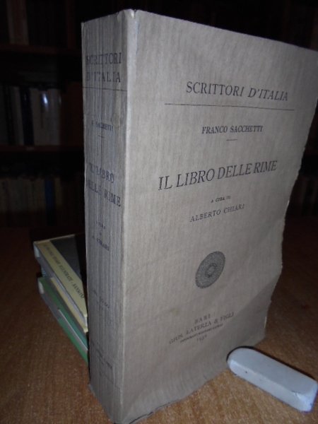 Franco, Sacchetti. Bari, Gius. Laterza & Figli, 1936. (Scrittori d' Italia) Il libro delle rime. A cura di Alberto Chiari. In - 8°, br. orig. 550 pp. Ben conservato. Neg. mob. 16