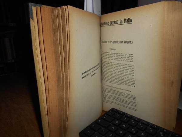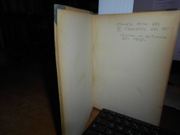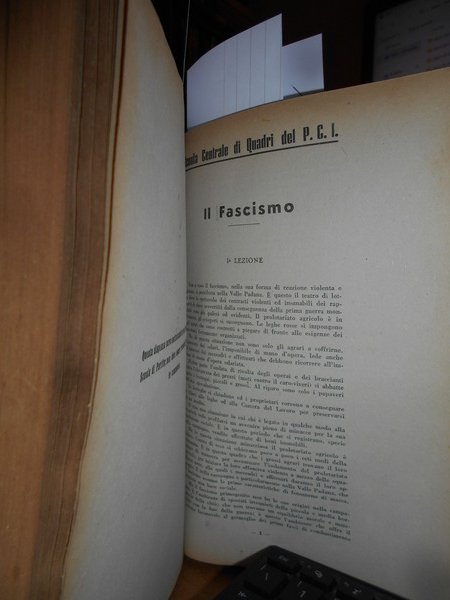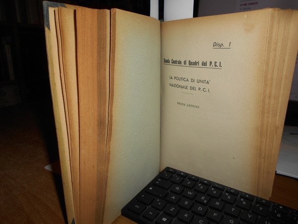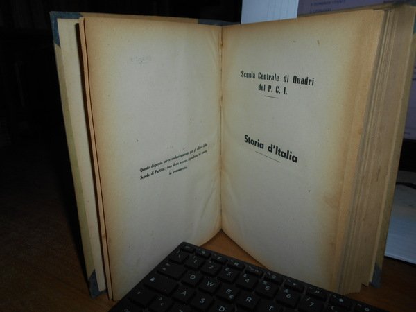 Scuola Centrale di Quadri del P.C.I. Storia d' Italia. 45 dispense 1945. Stampato prima del V Congresso del P.C.I. quindi in autunno del 1945. In-8°, legatura muta in m.tela con piccole punte. 45 dispense legate assieme. In buono stato di conservazione con carta leggermente ingiallita. Neg. mob. nero in basso entro busta trasp.