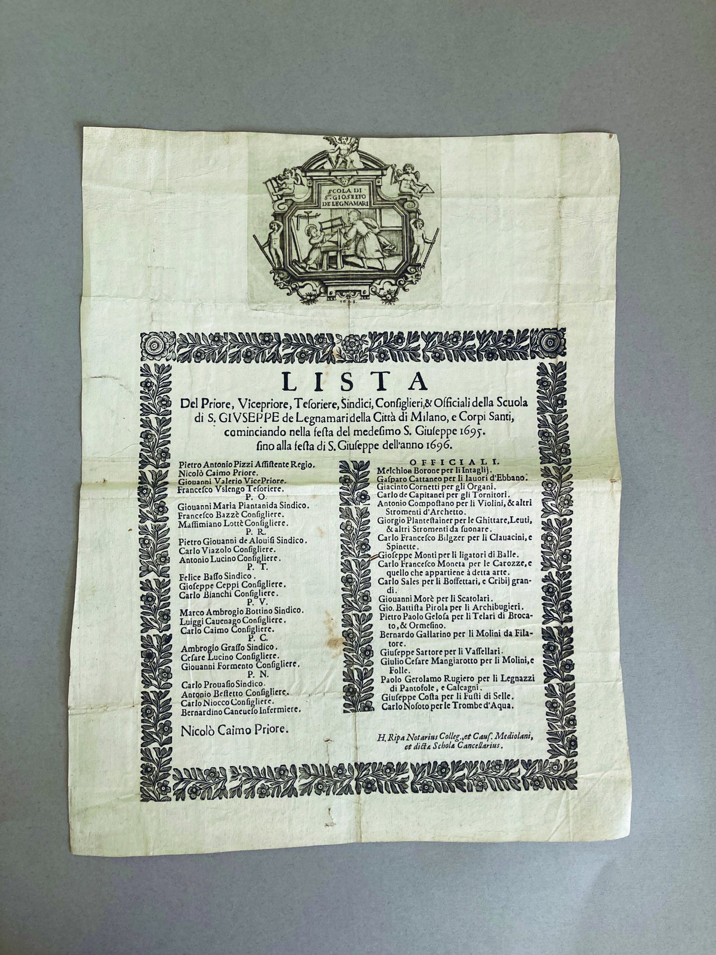 In-folio, cm 47x37, in testa al foglio una bella acquaforte raffigurante San Giuseppe in falegnameria con un bambino, racchiusa in cornice architettonica contorniata da putti e la data 1648 al margine inferiore. Al centro del foglio entro cornice silografica a motivo floreale la lista dei nomi e degli incarichi ufficiali degli appartenenti alla corporazione milanese dei falegnami. Interessante, raro e ben conservato.. *** TUTTI I NOSTRI LIBRI SONO VISIBILI PREVIO CONTATTO MAIL O TELEFONO NELLA NUOVA SEDE DI MILANO: LIBRERIA COSMOPOLIS, VIA JOMMELLI, 22. ***