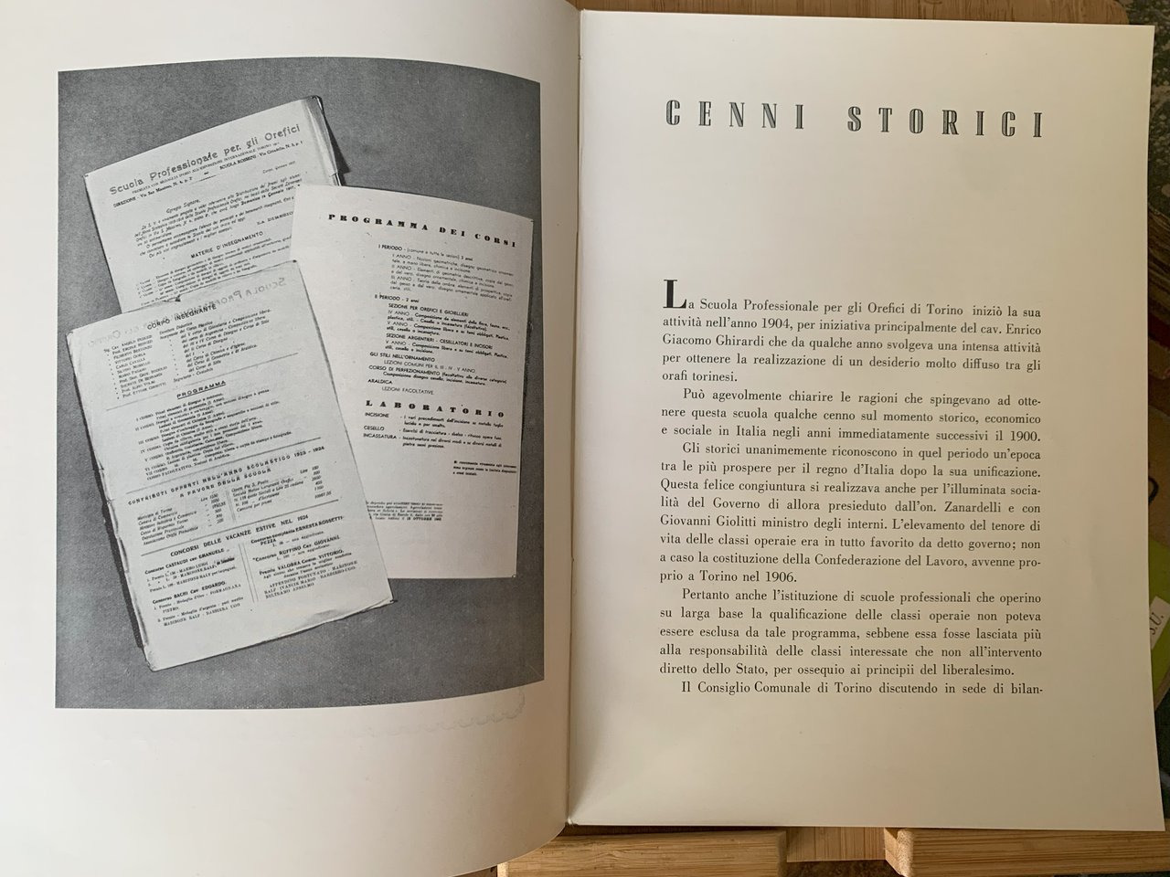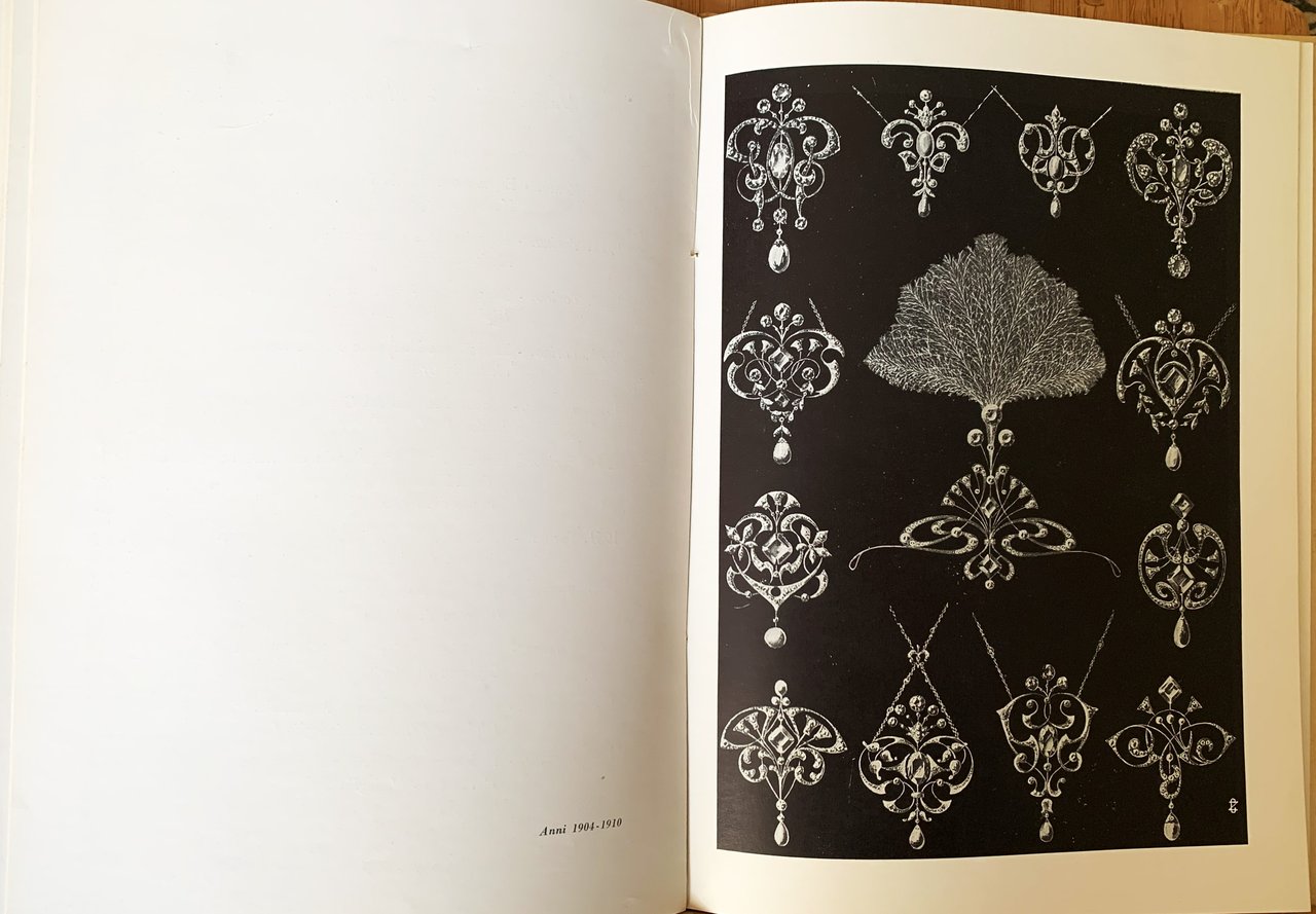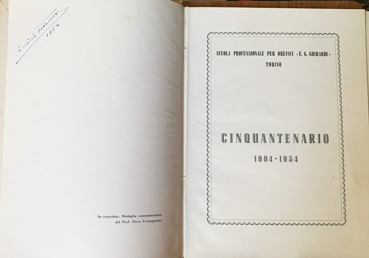 I ed. (29 giugno 1956). Volume pubblicato come atto conclusivo delle manifestazioni indette per il Cinquantenario della Scuola Professionale per Orefici "E. G. Ghirardi" di Torino (1904-1954). VIII/ (154)/ rilegatura muta avorio con al primo piatto una riproduzione dorata di una medaglia figurata della Scuola Professionale (medaglia commemorativa del Prof. Piero Formagnana)/ cofanetto editoriale muto in cartoncino avorio. Con illustrazioni in b/n. Stato buono (cofanetto brunito - copertina e fogli di guardia con qualche fioritura - allentamento della rilegatura - firma di possesso ad inchiostro blu in antiporta - pagine lievemente ingiallite). Indice: Premessa; Emilio Ostorero (Presidente) - presentazioni (Il Ministro della Pubblica Istruzione Paolo Rossi (Roma, 30 dicembre 1955) - Il Sindaco di Torino avv. Amedeo Peyron (23 marzo 1956) - Il Direttore del Consorzio Provinciale per l'Istruzione Tecnica di Torino E. Galgano (Torino, 6 aprile 1956) - Il Presidente della "Confedorafi", Unione Italiana delle Federazioni Nazionali tra Industriali Commercianti Artigiani Orafi Gioiellieri Argentieri Orologiai ed Affini, Davide Ventrella - Il Presidente dell'Associazione Piemontese Orafi, Gioiellieri, Argentieri, Orologiai ed Affini, Giulio Garzena) - Cenni storici; Gaetano Magliocca - Un vivaio per l'industria e l'artigianato; Luigi Illario - Mestieri che scompaiono e scuola d'eccezione; Giacomo Negri - I corsi di perfezionamento; Piero Formagnana - L'oreficeria e lo studio della plastica - Presidente onorario - Presidenti affettivi - Vice-Presidenti - Segretari - Tesorieri - Sovraintendenti - Consiglieri onorari - Revisori dei Conti - Direttore onorario - Direttori effettivi - Segretari ddella Scuola - Insegnanti - grafici iscritti-promossi-licenziati - Rappresentanti e Delegati - Partecipazione a Mostre ed Esposizioni - tavole - Studi e pensieri (Introduzione storica all'oreficeria piemontese; Alfo Volmi - L'arte del gioiello e le sue evoluzioni; Massimo Porta - I colori che nascono dal fuoco; Dott. Bruno Martinazzi - Personalità artistica ed artigiana dell'orafo; Mario E. Roggero).
