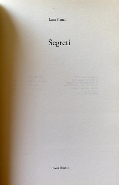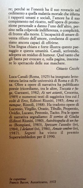 La prosa e la poesia di Luca Canali sono ispirate a un ideale di pulizia e di onestà che confina e si confonde con l'utopia, con l'aspirazione a un mondo diverso, vivibile, possibilmente felice. E un mondo che non esiste, che bisogna configurare, immagine e non realtà, come rovescio dell'altro mondo, quello in cui viviamo e che a Canali,e non solo a lui, non piace. Non gli piace perché è un mondo corrotto, un mondo in cui si è ammalato il rapporto umano. Non c'è amore né reciproca comprensione: c'è invece ipocrisia, menzogna, falsità, corruzione. Non si è ammalato soltanto il rapporto tra uomo e uomo, - la malattia, in una parola, si chiama disonestà, - anche il rapporto interiore che fa di ogni uomo un individuo tra individui, capace di distinguere in sé il personaggio, la maschera. Sempre meno individuo, sempre più maschera, l'uomo del nostro tempo cede a quella malattia, soccombe, fa tutt'uno con i suoi segreti. Se si oppone a questo declino, mette in gioco la propria vita. Come uno dei personaggi di questi racconti, cede a quel male degli onesti che un tempo lontano i romanzieri chiamavano crepacuore. C'è ancora qualcuno a questo mondo che possa dirsi onesto? Lo scrittore, il poeta, Canali risponde di sì, ma il moralista gli dà sulla voce, gli toglie ogni illusione. L'onesto a cui viene affidata una pratica emblematica di corruttela finirà perdente. A un certo punto dell'indagine non avrà più dove voltare il viso. I segreti di una piccola e media borghesia avida e capace d'ogni raggiro lo sommergeranno. C'è l'amicizia, dirà a se stesso l'onesto funzionario che traversa il primo di questi racconti. Ma là dove spera di trovare aiuto, comprensione, parole di incoraggiamento, troverà di nuovo corruzione, ipocrisia, avidità. Quella borghesia imbarbarita dal denaro tenta di nascondere i suoi segreti, ma si mostra per quello che è: un insieme discorde e rabbioso di personaggi incapaci di onestà e di amore; perché se l'onestà ha il suo rovescio nel cedimento a quella malattia mortale che infetta i rapporti umani e sociali, l'amore ha il suo compimento nel ricatto, nell'opera di promozione personale a danno l'uno dell'altro, persino nella colpevole indifferenza, o complicità, di fronte alla morte. L'incapacità di amare diventa rifiuto dell'amore, condanna di quanti siano ancora capaci di offrirne. Una lingua chiara e forte illustra questo paesaggio e questa umanità.