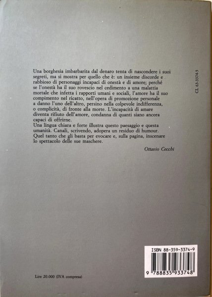 Una borghesia imbarbarita dal denaro tenta di nascondere i suoi segreti, ma si mostra per quello che è: un insieme discorde e rabbioso di personaggi incapaci di onestà e di amore; perché se l'onestà ha il suo rovescio nel cedimento a una malattia mortale che infetta i rapporti umani e sociali, l'amore ha il suo compimento nel ricatto, nell'opera di promozione personale a danno l'uno dell'altro, persino nella colpevole indifferenza, o complicità, di fronte alla morte. L'incapacità di amare diventa rifiuto dell'amore, condanna di quanti siano ancora capaci di offrirne. Una lingua chiara e forte illustra questo paesaggio e questa umanità. Canali, scrivendo, adopera un residuo di humour. Quel tanto che gli basta per evocare e, sulla pagina, inscenare lo spettacolo delle sue maschere. Ottavio Cecchi.