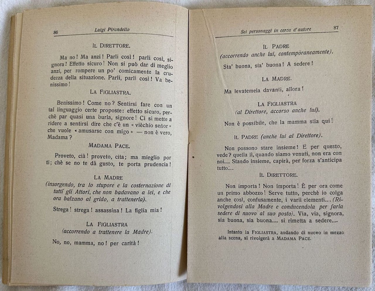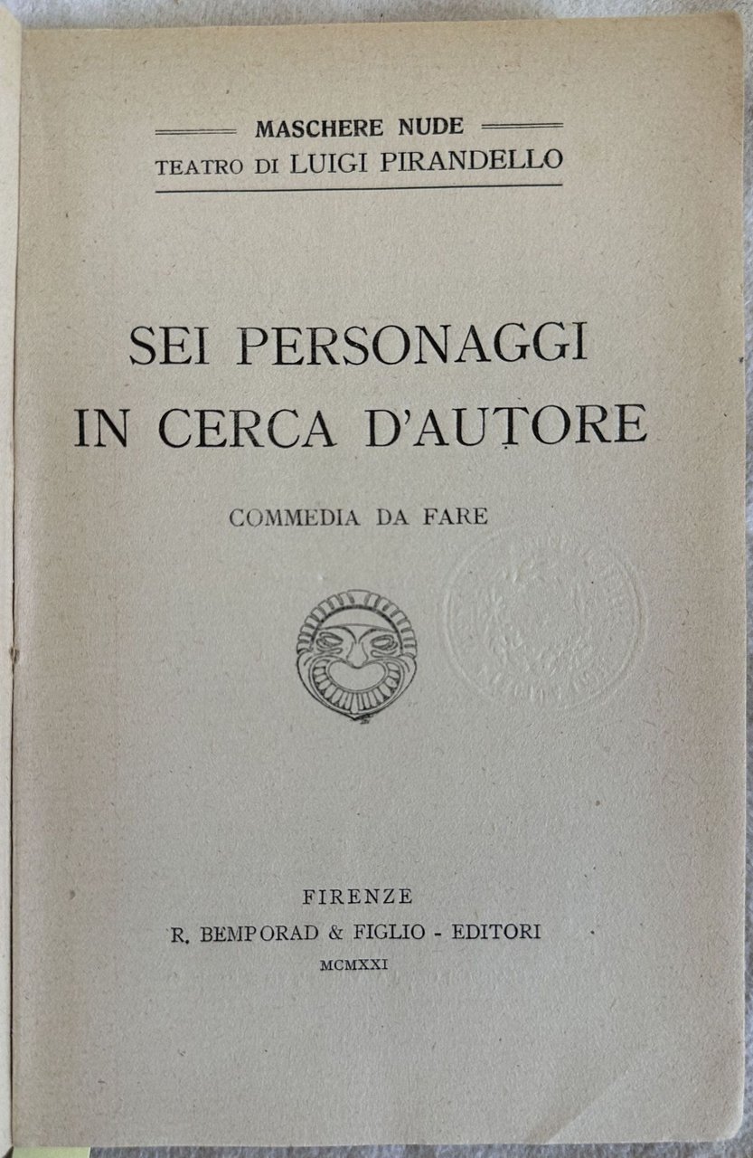 Prima edizione del 1921 della celebre commedia di Luigi Pirandello (1867-1936) della raccolta "Maschere nude" volume 3. «Sei personaggi» fu rappresentato per la prima volta dalla Compagnia di Dario Niccodemi il 10 maggio 1921 al Teatro Valle di Roma: fu fischiato, ma segnò un punto di svolta nella carriera del drammaturgo, come illustra bene Silvio DAmico: indusse [.] i critici fino allora restii, o semplicemente perplessi, a un esame di coscienza, donde almeno alcuni proprio in Roma giunsero a una vera e propria rivelazione. Sono della fine di quell'anno (ottobre - novembre 1921) gli articoli e saggi e conferenze in cui più d'uno fra essi, correggendo le antiche convinzioni o addirittura capovolgendole, propose ai propri lettori e ascoltatori la «scoperta» di Pirandello, l'illustrazione della sua ideologia, del suo significato, del suo stile, della sua arte: riconoscendone la singolarissima importanza, e diciamo pure la grandezza, quale annunciatore, nella scena italiana ed europea, dun verbo nuovo. Questa valutazione, a cui una notevole parte della stampa cominciò ad accedere più o meno sollecitamente, e che incuriosì il pubblico, aveva già creato un nuovo clima intorno a Pirandello quando, nel febbraio 1922, Ruggero Ruggeri rappresentò a Milano l'«Enrico IV». Già nello stesso 1921 «Sei personaggi» ebbe un grande successo il 27 settembre al Teatro Manzoni di Milano e fu rappresentato a Londra e New York nel corso del 1922, segnando lavvio della fortuna di Pirandello in tutto il mondo. Silvio D'Amico, «Prefazione» (in: Pirandello, «Maschere Nude», Milano, Mondadori, 1958, pp.15-16) "Rappresentata a Roma nel 1921. Abbastanza raro e piuttosto ricercato" (Cfr. Parenti p. 691). Brossura riquadrata a due colori con fregio in rosso. In ottime condizioni Copertina editoriale in ottime condizioni con lievi usure ai margini e dorso. Legatura in buone condizioni. Pagine in ottime condizioni generali con rare fioriture. In 16. Dim. 18,5x12,5 cm. Pp. 141+(3).First edition of 1921 of the famous play by Luigi Pirandello (1867-1936) of the collection "Maschere nude" volume 3. "Rappresentata a Roma nel 1921. Abbastanza raro e piuttosto ricercato" (Cfr. Parenti p. 691). Editorial cover with red frame and a decoration. In good conditions. Editorial cover in good conditions lightly worn with wearings in the extremities. Binding in good conditions. Inside pages are in very good conditions with occasional foxing. In 16. Dim. 18,5x12,5 cm. Pp. 141+(3).