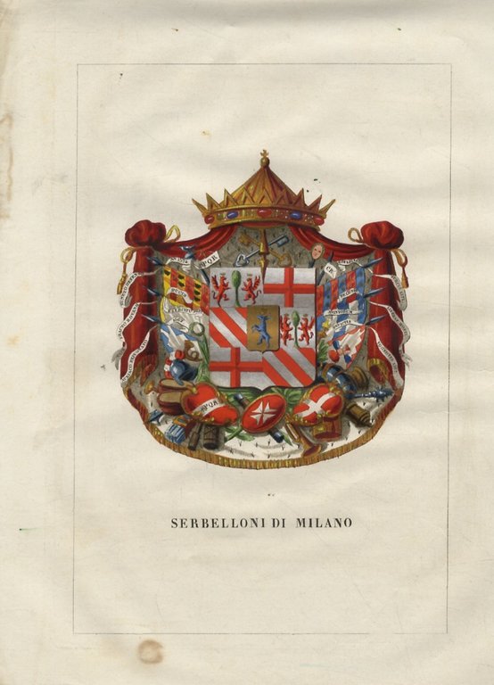 Lodi, Wilmant e figli, 1841-1848, in-4, privo di brossura, pp. [16]. Con un bello stemma accuratamente miniato a mano all'epoca, in vividi colori, con particolari dorati e argentati, su una tavola f.t. Fascicolo a fogli sciolti, dedicato alla storia della famiglia, tratto da "Teatro araldico, ovvero Raccolta generale delle armi ed insegne gentilizie delle più illustri e nobili casate che esisterono un tempo e che tuttora fioriscono in tutta Italia" di Leone Tettoni e F. Saladini, Lodi, Wilmant e figli, 1841-1848. ottime condizioni.
