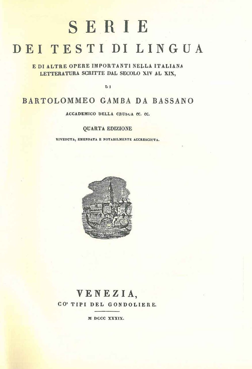 Serie dei testi di lingua e di altre opere importanti nella italiana letteratura scritte dal secolo XIV al XIX. Venezia, Tipi del Gondoliere 1839, ma