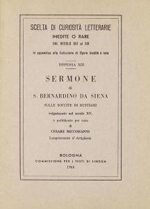 40 pagine. Brossura. In-16. gr 40. VOLUME IN OTTIME CONDIZIONI. Collana: Scelta di curiosità letterarie inedite o rare dal secolo XIII al secolo XVII, 13. Uno dei sermoni di Bernardino da Siena , al secolo Bernardino Albizzeschi (Massa Marittima, 8 settembre 1380 - L'Aquila, 20 maggio 1444), santo dalla Chiesa Cattolica. Ristampa anastatica dell'edizione originale (1862)