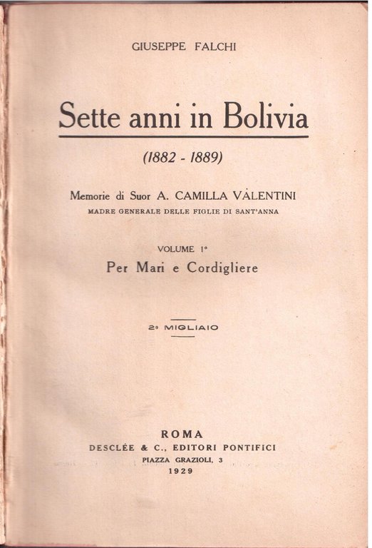 Sette anni in Bolivia ( 1882-1889 ) Memorie di Suor A. Camilla Valentini, Madre Generale delle Figlie di Sant'Anna