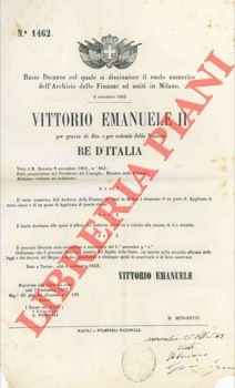 Torino, 1863, 6 settembre, Regio Decreto di cm. 25 x 40 con stemma reale e a firma Vittorio Emanuele. Con timbro e annotazioni a mano.