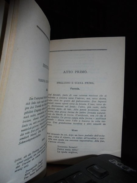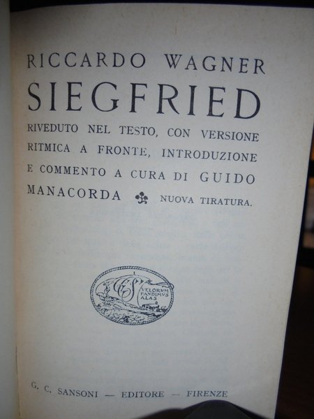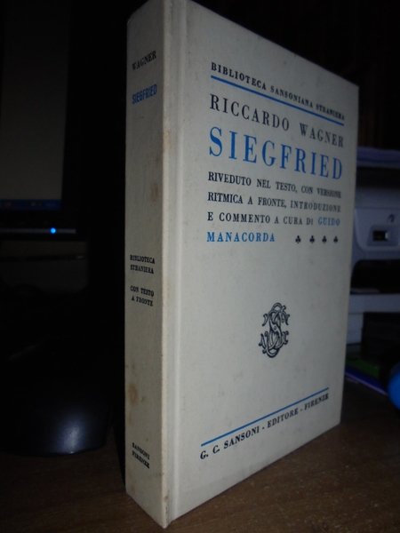 RICCARDO, WAGNER. Firenze, Sansoni Editore, s.d. 1955? SIEGFRIED. Riveduto nel testo con versione ritmica a fronte, introduzione e commento a cura di Guido Manacorda. In-24° grande, cartonato edit. xviii, 331, (2) pp. Ben conservato. Uff. pacco F. carc