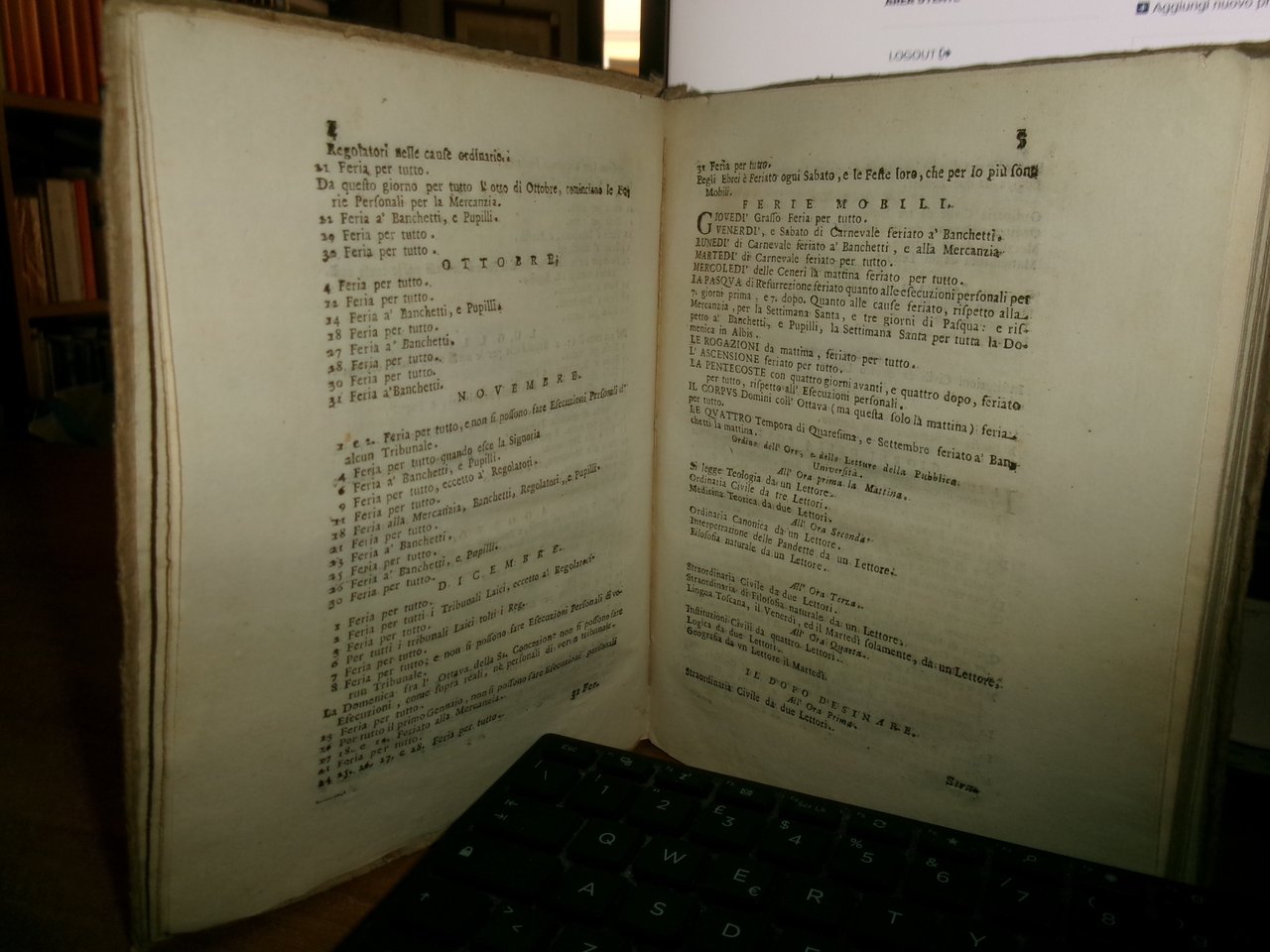 (Siena) (Gigli, Girolamo). Siena, presso Francesco Quinza, 1722. Diario Sanese in cui si veggono alla giornata tutte le cose importanti si allo spirituale, come al temporale della Città, e però continente feste, stazioni, signorie, residenze dei maestrati, fiere dello Stato, ferie, giorni della posta, e notizie per la partenza delle lettere. E finalmente cose notabili accadute in Siena in quella giornata, coll' indice in ultimo di tutti i santi sanesi, e famiglie nobili della Città. In-4°, cartone coevo. 241 pp. Edizione originale che precede quella descritta dal Lozzi al n. 5121. Uff. Mob. 2.