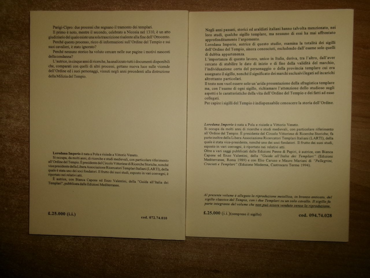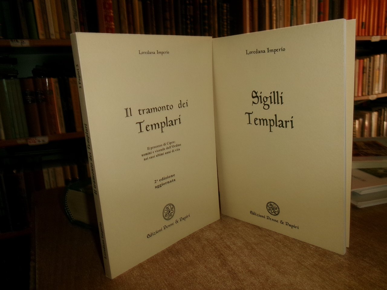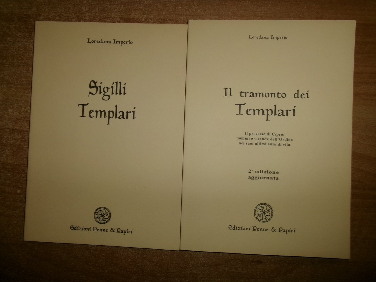 SIGILLI TEMPLARI. Il TRAMONTO DEI TEMPLARI. IMPERIO LOREDANA. Latina, Edizioni Penne & Papiri, 1994 - 1996. 2 volumi in-8°, br. edit. 67 pp. con illustrazioni in bianco e nero n.t. 153 pp. senza illustrazioni. Come nuovo. Neg. mob. 18 entro busta trasp.