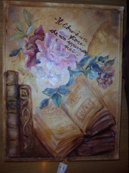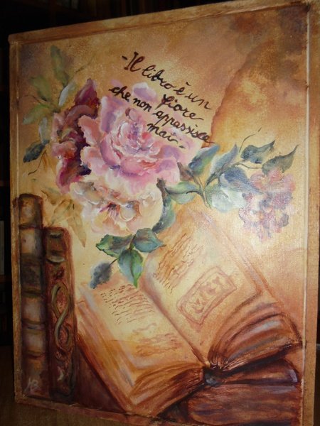 Simpatico acrilico su tela montato su cornice in legno raffigurante in primo piano un libro aperto, altri libri chiusi e alcuni fiori. Una scritta è presente col seguente testo: Il libro è un fiore che non appassisce mai. (cm. 42 x 31). Nel retro la firma dell' autrice Marina Brighenti. Spedizione tramite Poste Italiane con paccoordinario (tracciato) a euro 9.