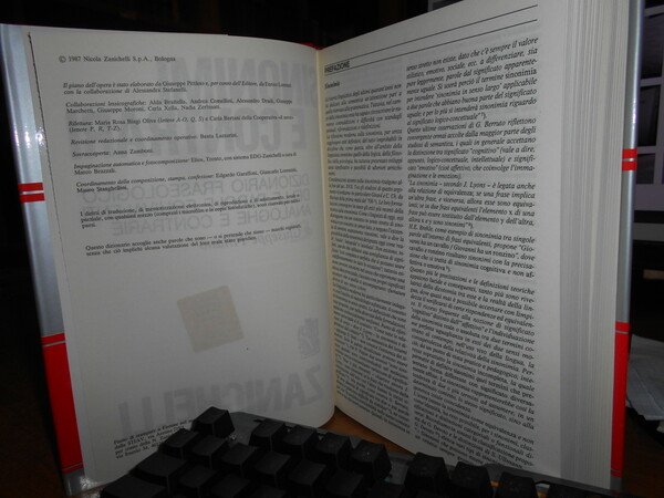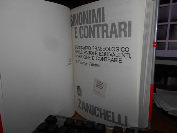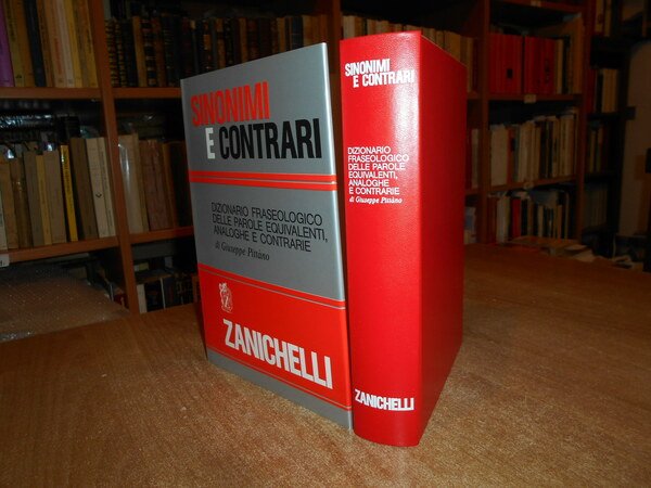 Giuseppe Pittàno. Bologna, Zanichelli Editore, 1987. SINONIMI E CONTRARI. Dizionario fraseologico delle parole equivalenti, analoghe e contrarie. In-8°, cartonato edit. rosso con sovracopertina. 863 pp. Come nuovo. Uff. stanz. TV. mob. fronte nostro