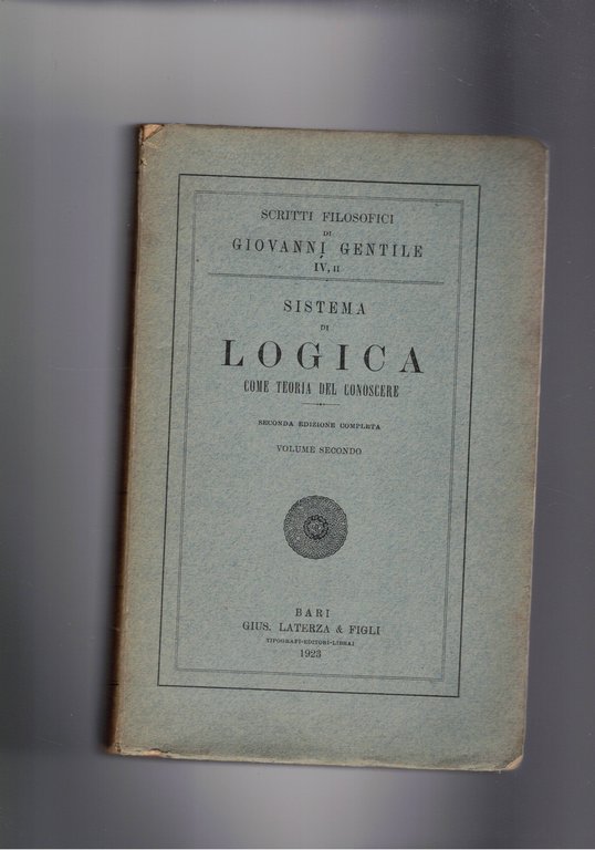 Sistema di logica come teoria del conoscere. seconda ediz. solo 2° volume. Vol. IV° e tomo 2° degli scritti filosofici di G.G.