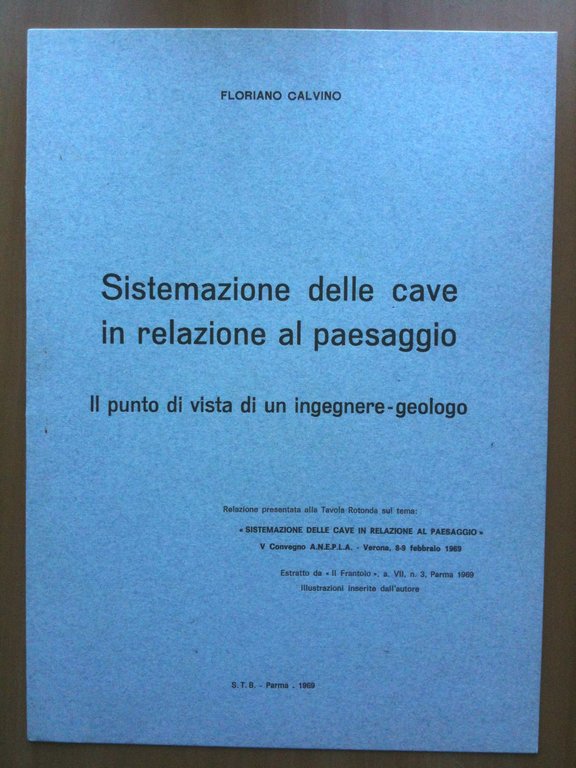 SISTEMAZIONE DELLE CAVE IN RELAZIONE AL PAESAGGIOIl punto di vista di un ingegnere-geologoFloriano Calvinorelazione presentata alla tavola rotonda sul temaV Convegno A.N.E.P.L.A. - Verona 8-9 febbraio 1969Estratto da "Il Frantoio" a. VII, n. 3, Parma 19694 pagine formato 21x29(50 g)E3351