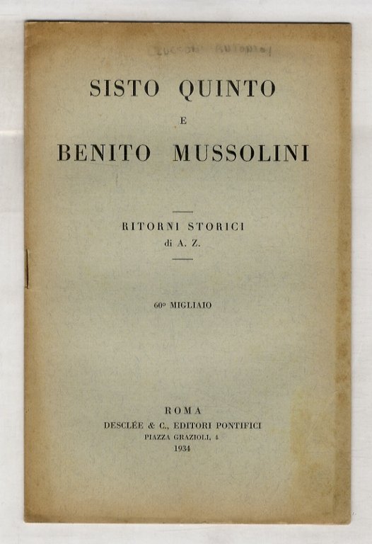 Roma, Desclée & C. editori pontifici, 1934, in-8 piccolo, br. editoriale, pp. 16. Con un ritratto fotografico di Mussolini.