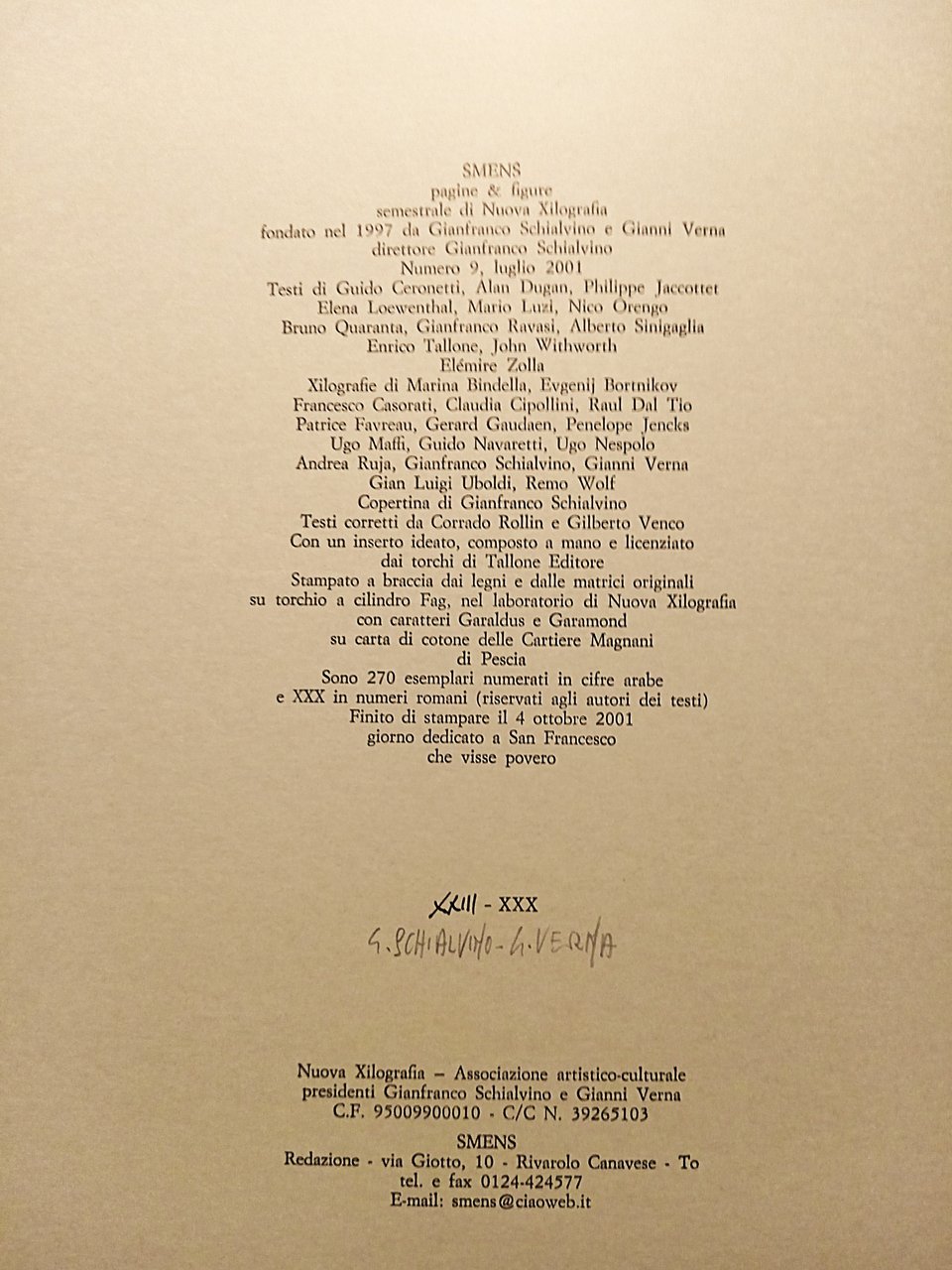 Xilografie di Marina Bindella, Evgenij Bortnikov, Francesco Casorati, Claudia Cipollini, Raul Dal Tio, Patrice Favreau, Gerard Gaudaen, Penelope Jencks, Ugo Maffi, Guido, Navaretti, Ugo Nespolo, Andrea Ruja, Gianfranco Schialvino,