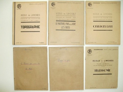 SNCF : Ecole de Limoges. Formation des Piqueurs pour les fonctions de chef de district. Ouvrages d'Art (novembre 1946) - Topographie (janvier 1948) - Engins de Gare - Le matériel fixe de la Voie. Les Rails (septembre 1946) - Le matériel fixe de la voie. Les Bois (janvier 1947) - Téléphonie (septembre 1946)