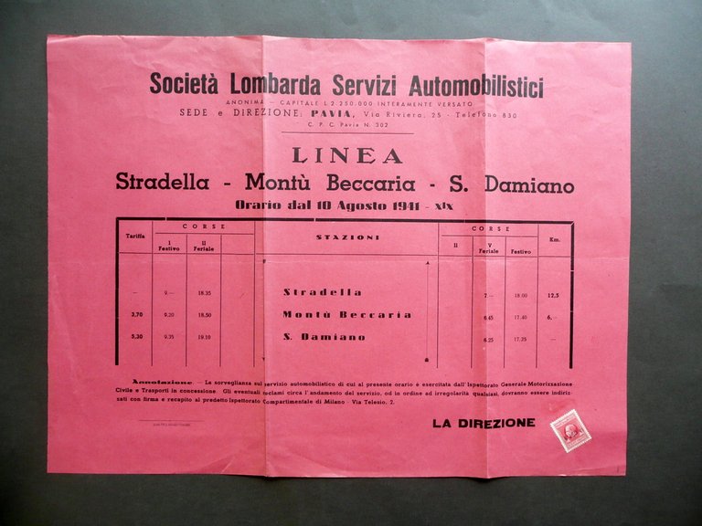 Societ‡ Lombarda Servizi Automobilistici Pavia Manifesto 1941 Mont˘ Beccaria