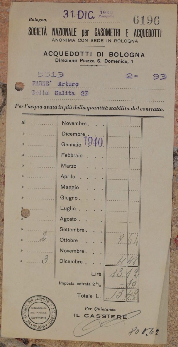 In 8. Dim. cm 21,5x11. Bel documento del gennaio 1940, un conguaglio per la fornitura d'acqua da parte della Societa nazionale per gasometri e acquedotti degli acquedotti di Bologna. Note manoscritte al verso. In buone condizioni. Beautiful document of january 1940, a final invoice for consumption of water by Societa nazionale per gasometri e acquedotti of waterducts in Bologna. Handwritten notes in the verso. In good conditions.