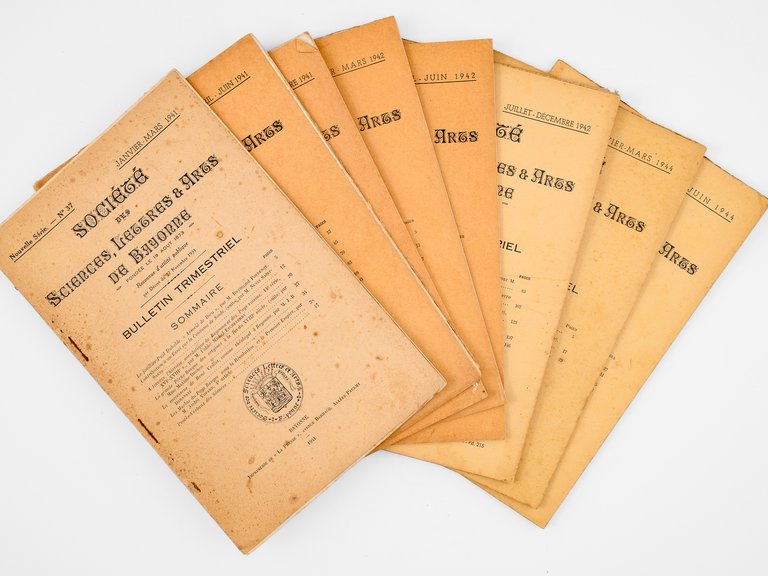 Société des Sciences, Lettres & Arts de Bayonne - Bulletin trimestriel [ Lot de 8 numéros parus sous l'Occupation ] n° 37 Janvier-Mars 1941 ; n° 38 Avril-Juin 1941 ; n° 39 Juillet-Décembre 1941 ; n° 40 Janvier-Mars 1942 ; n° 41 Avril-Juin 1942 ; n° 42 Juilet-Décembre 1942 ; n° 47 Janvier-Mars 1944 ; n° 48 Avril-Juin 1944. | Libri antichi e moderni | Collectif, Duhalde, Paul, Nussy-Saint-Saens, M., Etcheverry, Michel (Abbé), Degros, Maxime (Madame), Daranatz, J.-B., Vovard, André, Etc.